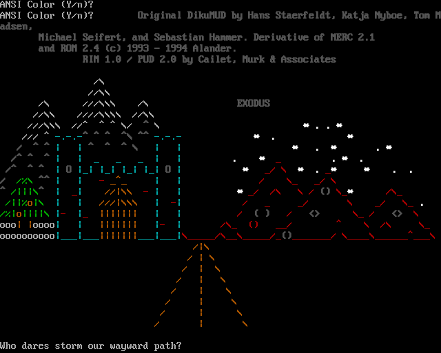 ANSI Color (Y/n)? ANSI Color (Y/n)? Original DikuMUD by Hans Staerfeldt, Katja Nyboe, Tom Madsen, Michael Seifert, and Sebastian Hammer. Derivative of MERC 2.1 and ROM 2.4 (c) 1993 - 1994 Alander. RIM 1.0 / PUD 2.0 by Cailet, Murk & Associates /\\ //\\\\ /\\ ///\\\\\\ /\\ EXODUS //\\\\ ////\\\\\\\\ //\\\\ ///\\\\\\ //^ ^ ^ \\/ ^ \\ \* . . \* /// ^ -​.-.-^ ^ ^ ^\\ ^^ -​.-.- \* . \* / ^ ^ \| \| ^ ^ ^ \\ \| \| \* . \* . \* /^ ^ ^ \| \| _ _ _ \| \| . \* _ . \* . /^ ^ ^ \| O \|_\| \|_\| \|_\| \|_\| O \| \* _/ \\ \* . _\* \* . . / /%\\ ^^ \| \| - _^_ \| \| / \\_ _/ \\ ^ /\|\|\|\\^ \| _\| //\|\\\\ - \| \| \* _/ /\\ \\ / () \\_\* /\\_ /\|\|%o\|\\ \| \| ///\|\\\\\\ \| -\| / _ _/ \\ _/ \\_ . /%\|o\|\|\|\|\\ \|- \|_ \|\|\|\|\|\|\| \| \| / ( ) / <> \\_ / <> \\ ooo\| \|oooo\| \| \|\|\|\|\|\|\| \|- \| /\\_ () __/ ^ \\ /\\ \\_ oooooooooo\|___\|___\|\|\|\|\|\|\|___\|___\|\\_​____/\\__\\_​____/_()_​______/ \\_​___\\_​_____^___\\ /\|\\ / \| \\ / \| \\ / \| \\ / \| \\ / \| \\ / \| \\ / \| \\ Who dares storm our wayward path?