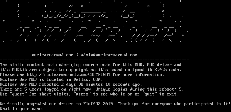 + . . . . _ . . + . . . + . \| . . + . // \* . . . _/_ . \* . \| . . . -\*- . , , , _ // _. _​_______ _ . . / __ . -\*- . . \| . (_(_/_</_</_(__(_) / / <</_ <__(_) . \| . . + . \* . . + . . \* . . . + . \* . . . _ __ _ . _ __ . _ __ . __ + _ __ . _ . __ _ __ . . ' ) ) ' ) / / ) _// / \` / ) ' ) ) ' ) / / ) ' ) ) . . / / / / / / /-- /--/ /--' . / / / /--/ /--' + . + / (_ (__/ (__/ /___ (___, / (_ / \\_ . (_(_/ / (_ / \\_ . -​---------------------------------------------------------------------------- nuclearwarmud.com \| admin@nuclearwarmud.com =​============================================================================ The static content and underlying source code for this MUD, MUD driver and it's MUDLib are subject to copyright as it's based on lpmudlib 2.4.5 code. Please see http://nuclearwarmud.com/COPYRIGHT for more information. Nuclear War MUD is located in Dallas, USA. Nuclear War MUD rebooted 2 days 38 minutes 10 seconds ago. There are 5 users logged on right now. Unique logins during this reboot: 5. Use "guest" for short visits, "users" to see who is on or "quit" to exit. We finally upgraded our driver to FluffOS 2019. Thank you for everyone who participated in it! What is your name: