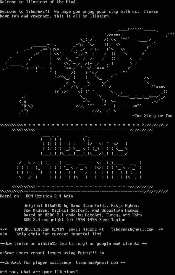Welcome to Illusions of the Mind. Welcome to Tibernas!! We hope you enjoy your stay with us. Please have fun and remember, this is all an Illusion. _ __,-​---'^​^^^^\`-​----.__ . . \`//=​===- _​___,'^\` -. \\_\|// . /\|\|\\\\ \`^^\`-​--.___./ _​_____-==. _-^o \`\\/ \|\|\| \\\\ _,'\` __,--' ,=='\|\|\\=_ ;_,_,/ _-'\|- \|\`\\ \\\\ ,' _-' ,=' \| \\\\\`. '',/+7 /- / \|\| \`\\. / .' ,' \| \\\\ \\_ " / /- / \|\| \\ / / _​____ / \| \\\\.\`-_/ /\|- _/ ,\|\| \\ / ,-' \`-\|--'\|\`--_ \\ \`==-/ \`\| \\'-​-===-' _/\` ' ' \`-\| /\| )-'\\/' _,--"' '-^^\\_/ \| \| \`\\_ ,^ /\\ / \\ \\__ \\/^ \`\\__ _,-' _/'\\ ,-'^​____-'\`-/ \`\`===\\ ((->/' \\\|\|\|' \`. \`\\. , _\|\| ./ \\_ \`\\ \`^​---\|__i__i__\\--/'_/ <_n_ _​_-^-_ \`) \\-​.______________,-/' \`B'\\) ///,-'^\`_​_--^- \|-​------\*\*^' /^> ///,--/\`-\\ \` \` -Tua Xiong or Tom \\\\\\\\\\\\\\\\\\\\=​-=-=-=-=-=-=-=-=-=-=-=-=-=-=-=-=-=-=-=-=-=-=-=-=-/////////// \\\\\\\\\\\\\\\\\\\\=​-=-=-=-=-=-=-=-=-=-=-=-=-=-=-=-=-=-=-=-////////// ___ _ _ _ \|_ _\| \| \|_ _ ___(_) ___ _ __ ___ \| \|\| \| \| \| \| / __\| \|/ _ \\\| '_ \\/ __\| \| \|\| \| \| \|_\| \\__ \\ \| (_) \| \| \| \\__ \\ \|___\|_\|_\|\\__,_\|___/_\|\\___/\|_\| \|_\|___/ ___ __ _​____ _ __ __ _ _ / _ \\ / _\| \|_ _\| \|__ ___ \| \\/ (_)_ __ __\| \| \| \| \| \| \|_ \| \| \| '_ \\ / _ \\ \| \|\\/\| \| \| '_ \\ / _\` \| \| \|_\| \| _\| \| \| \| \| \| \| __/ \| \| \| \| \| \| \| \| (_\| \| \\___/\|_\| \|_\| \|_\| \|_\|\\___\| \|_\| \|_\|_\|_\| \|_\|\\__,_\| \\\\\\\\\\\\\\\\\\\\=​-=-=-=-=-=-=-=-=-=-=-=-=-=-=-=-=-=-=-=-////////// \\\\\\\\\\\\\\\\\\\\=​-=-=-=-=-=-=-=-=-=-=-=-=-=-=-=-=-=-=-=-=-=-=-=-=-/////////// Based on: ROM Version 2.4 beta Original DikuMUD by Hans Staerfeldt, Katja Nyboe, Tom Madsen, Michael Seifert, and Sebastian Hammer Based on MERC 2.1 code by Hatchet, Furey, and Kahn ROM 2.4 copyright (c) 1993-1995 Russ Taylor \*\*\* TOPMUDSITES.com ADMIN email Aldere at tibernas@gmail.com \*\* \*\*\* help admin for current immortal list \*\*Use tintin or wintin95 (wintin.org) or google mud clients \*\* \*\*Some users report issues using Putty!!! \*\* \*\*Contact for player assitance tibernas@gmail.com \*\* And now, what are your Illusions?