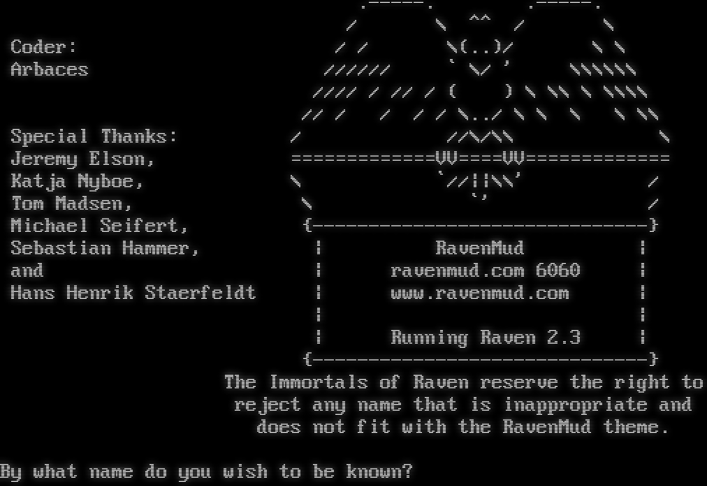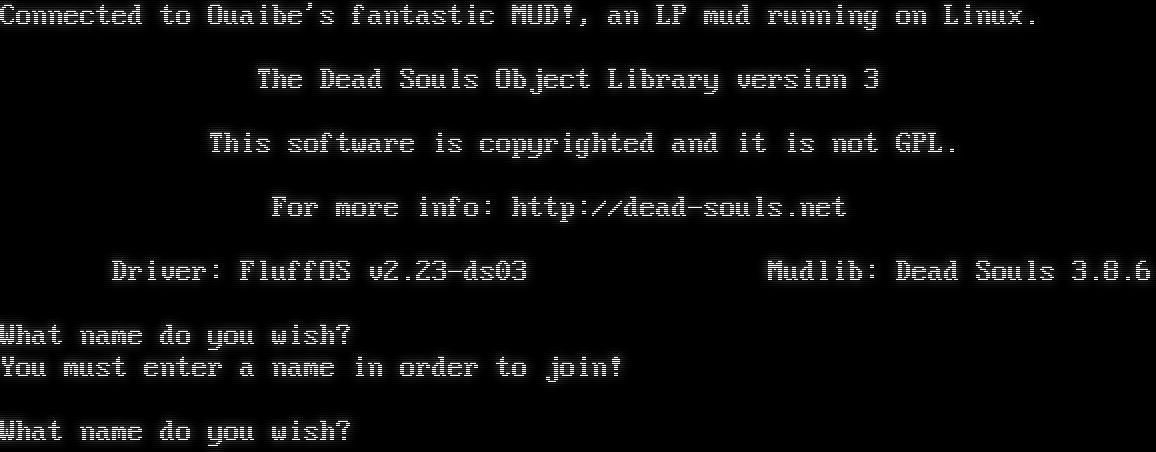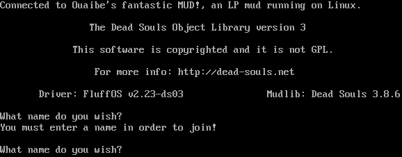 Connected to Ouaibe's fantastic MUD!, an LP mud running on Linux. The Dead Souls Object Library version 3 This software is copyrighted and it is not GPL. For more info: http://dead-souls.net Driver: FluffOS v2.23-ds03 Mudlib: Dead Souls 3.8.6 What name do you wish? You must enter a name in order to join! What name do you wish?