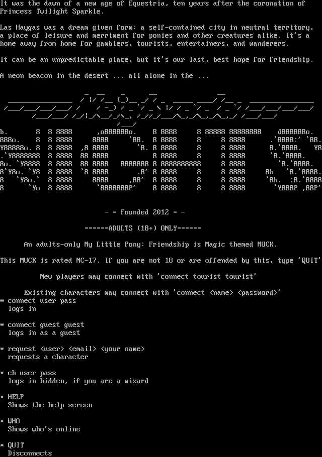 It was the dawn of a new age of Equestria, ten years after the coronation of Princess Twilight Sparkle. Las Haygas was a dream given form: a self-contained city in neutral territory, a place of leisure and merriment for ponies and other creatures alike. It's a home away from home for gamblers, tourists, entertainers, and wanderers. It can be an unpredictable place, but it's our last, best hope for Friendship. A neon beacon in the desert ... all alone in the ... _ __ _ __ __ _​_______________ / \|/ /__ (_)__ _/ / _ _​____ _​___/ /__ _ _​_______________ /___/___/___/___/ / / -_) / _ \`/ _ \\ \|/ / _ \`/ _ / _ \`/ /___/___/___/___/ /___/___/ /_/\|_/\\__/_/\\_, /_//_/___/\\_,_/\\_,_/\\_,_/ /___/___/ /___/ b. 8 8 8888 ,o888888o. 8 8888 8 88888 88888888 d888888o. 888o. 8 8 8888 8888 \`88. 8 8888 8 8 8888 .\`8888:' \`88. Y88888o. 8 8 8888 ,8 8888 \`8. 8 8888 8 8 8888 8.\`8888. Y8 .\`Y8888888 8 8888 88 8888 8 8888 8 8 8888 \`8.\`8888. 8o. \`Y8888 8 8888 88 8888 8888888 8 8888888888 8 8888 \`8.\`8888. 8\`Y8o. \`Y8 8 8888 \`8 8888 .8' 8 8888 8 8 8888 8b \`8.\`8888. 8 \`Y8o.\` 8 8888 8888 ,88' 8 8888 8 8 8888 \`8b. ;8.\`8888 8 \`Yo 8 8888 \`8888888P' 8 8888 8 8 8888 \`Y888P ,88P' - = Founded 2012 = - =​=====ADULTS (18+) ONLY=​===== An adults-only My Little Pony: Friendship is Magic themed MUCK. This MUCK is rated NC-17. If you are not 18 or are offended by this, type 'QUIT' New players may connect with 'connect tourist tourist' Existing characters may connect with 'connect <name> <password>' \* connect user pass logs in \* connect guest guest logs in as a guest \* request <user> <email> <your name> requests a character \* ch user pass logs in hidden, if you are a wizard \* HELP Shows the help screen \* WHO Shows who's online \* QUIT Disconnects
