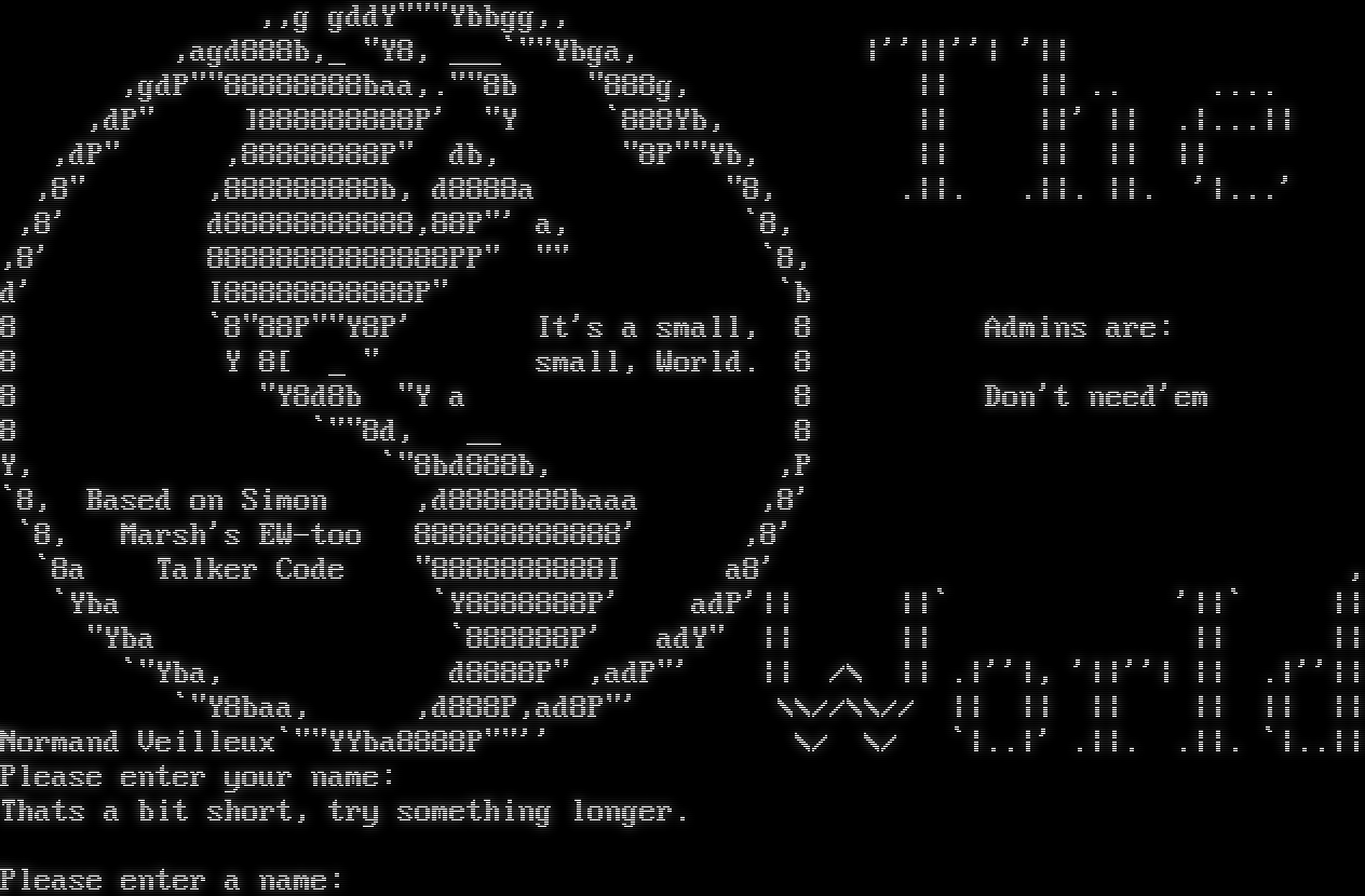 ,,g gddY"""Ybbgg,, ,agd888b,_ "Y8, ___\`""Ybga, \|''\|\|''\| '\|\| ,gdP""88888888baa,.""8b "888g, \|\| \|\| .. .​... ,dP" ]888888888P' "Y \`888Yb, \|\| \|\|' \|\| .\|...\|\| ,dP" ,88888888P" db, "8P""Yb, \|\| \|\| \|\| \|\| ,8" ,888888888b, d8888a "8, .\|\|. .\|\|. \|\|. '\|...' ,8' d88888888888,88P"' a, \`8, ,8' 88888888888888PP" "" \`8, d' I88888888888P" \`b 8 \`8"88P""Y8P' It's a small, 8 Admins are: 8 Y 8[ _ " small, World. 8 8 "Y8d8b "Y a 8 Don't need'em 8 \`""8d, __ 8 Y, \`"8bd888b, ,P \`8, Based on Simon ,d8888888baaa ,8' \`8, Marsh's EW-too 888888888888' ,8' \`8a Talker Code "8888888888I a8' , \`Yba \`Y8888888P' adP'\|\| \|\|\` '\|\|\` \|\| "Yba \`888888P' adY" \|\| \|\| \|\| \|\| \`"Yba, d8888P" ,adP"' \|\| /\\ \|\| .\|''\|, '\|\|''\| \|\| .\|''\|\| \`"Y8baa, ,d888P,ad8P"' \\\\//\\\\// \|\| \|\| \|\| \|\| \|\| \|\| Normand Veilleux\`""YYba8888P""'' \\/ \\/ \`\|..\|' .\|\|. .\|\|. \`\|..\|\| Please enter your name: Thats a bit short, try something longer. Please enter a name: