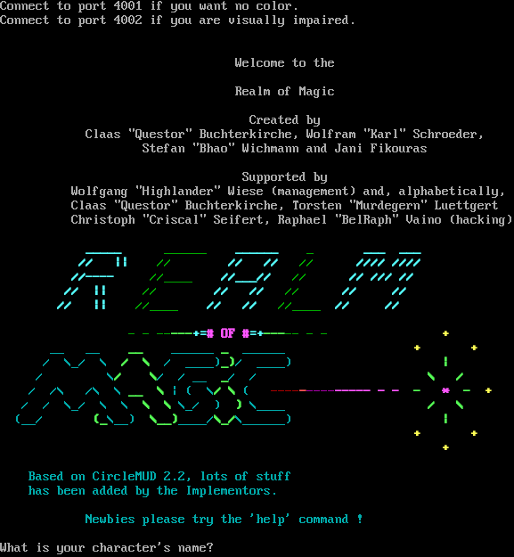 Connect to port 4001 if you want no color. Connect to port 4002 if you are visually impaired. Welcome to the Realm of Magic Created by Claas "Questor" Buchterkirche, Wolfram "Karl" Schroeder, Stefan "Bhao" Wichmann and Jani Fikouras Supported by Wolfgang "Highlander" Wiese (management) and, alphabetically, Claas "Questor" Buchterkirche, Torsten "Murdegern" Luettgert Christoph "Criscal" Seifert, Raphael "BelRaph" Vaino (hacking) _​____ _​_____ _​_____ _ ___ ___ // \|\| // // // // //// //// //-​--- //_​___ //___// // // /// // // \|\| // // // // // // // \|\| //_​___ // // //_​___ // // - - -​----+=# OF #​=+----- - - + __ __ __ _​_____ _ _​_____ + + / \\_/ \\ / \\ / _​___)_)/ _​___) \| / \\/ \\/ / __ _/ / \\ / / /\\ /\\ \\ __ \\ \| ( \\/ \\ ( -​------------- - - - \* - + / / \\_/ \\ \\ \\ \\ \\_/ ) ) \\_​___ / \\ (__/ (_\\__) \\__)_​___/\\_/\\_​_____) \| + + + Based on CircleMUD 2.2, lots of stuff has been added by the Implementors. Newbies please try the 'help' command ! What is your character's name?