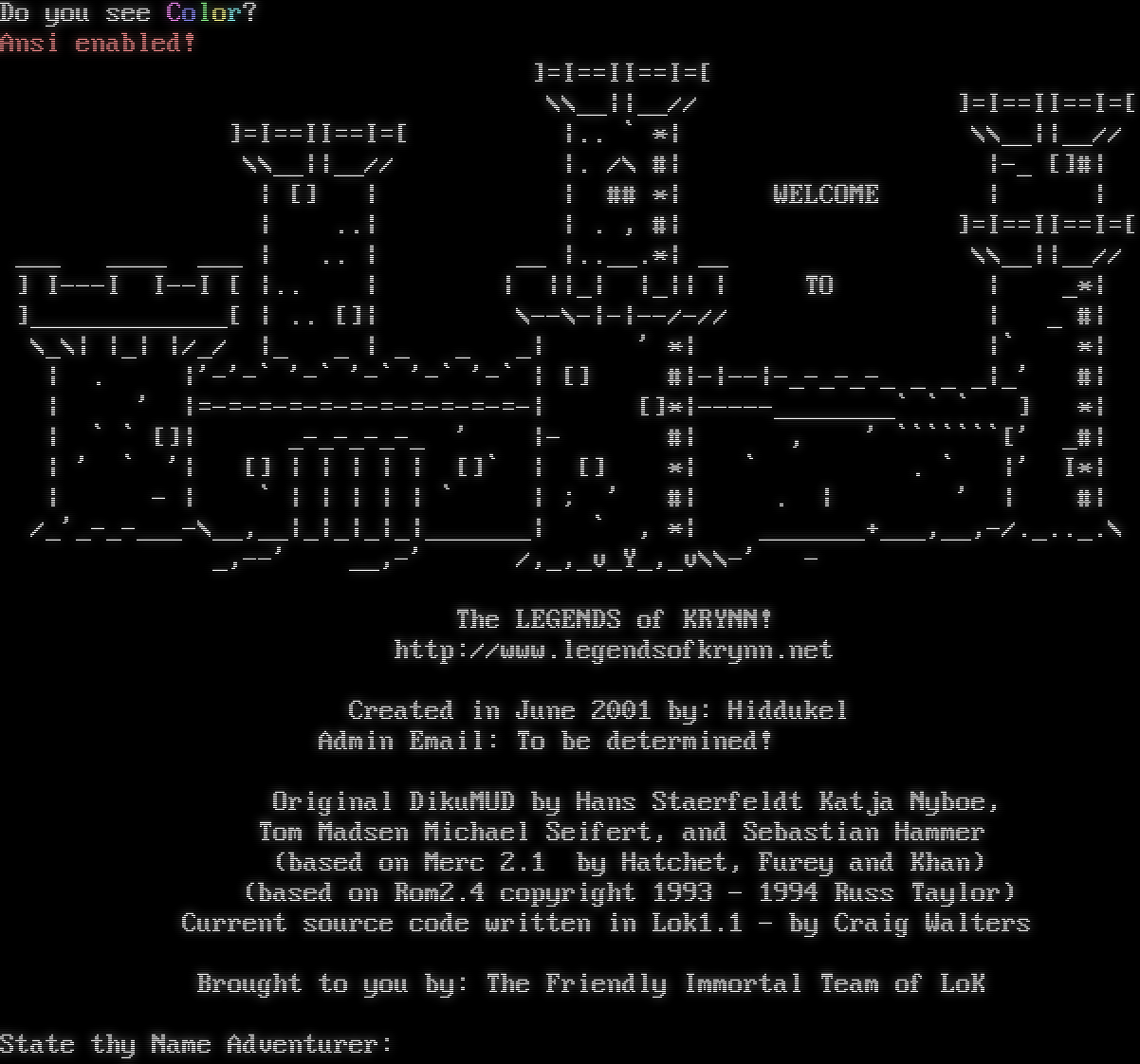 Do you see Color? Ansi enabled! ]=I==II==I=[ \\\\__\|\|__// ]=I==II==I=[ ]=I==II==I=[ \|.. \` \*\| \\\\__\|\|__// \\\\__\|\|__// \|. /\\ #\| \|-_ []#\| \| [] \| \| ## \*\| WELCOME \| \| \| ..\| \| . , #\| ]=I==II==I=[ ___ _​___ ___ \| .. \| __ \|.​.__.\*\| __ \\\\__\|\|__// ] I---I I--I [ \|.. \| \| \|\|_\| \|_\|\| \| TO \| _\*\| ]_​____________[ \| .. []\| \\--\\-\|-\|--/-// \| _ #\| \\_\\\| \|_\| \|/_/ \|_ _ \| _ _ _\| ' \*\| \|\` \*\| \| . \|'-'-\` '-\` '-\` '-\` '-\` \| [] #\|-\|--\|-​_-_-_-_ _ _ _\|_' #\| \| ' \|=​-=-=-=-=-=-=-=-=-=-=-\| []\*\|-​----________\` \` \` ] \*\| \| \` \` []\| _​-_-_-_-_ ' \|- #\| , ' \`\`\`\`\`\`\`[' _#\| \| ' \` '\| [] \| \| \| \| \| []\` \| [] \*\| \` . \` \|' I\*\| \| - \| \` \| \| \| \| \| \` \| ; ' #\| . \| ' \| #\| /_'_​-_-___-\\__,__\|_\|_\|_\|_\|_​______\| \` , \*\| _​______+___,__,-/.​_.._.\\ _,--' __,-' /,_,_v_Y_,_v\\\\-' - The LEGENDS of KRYNN! http://www.legendsofkrynn.net Created in June 2001 by: Hiddukel Admin Email: To be determined! Original DikuMUD by Hans Staerfeldt Katja Nyboe, Tom Madsen Michael Seifert, and Sebastian Hammer (based on Merc 2.1 by Hatchet, Furey and Khan) (based on Rom2.4 copyright 1993 - 1994 Russ Taylor) Current source code written in Lok1.1 - by Craig Walters Brought to you by: The Friendly Immortal Team of LoK State thy Name Adventurer:
