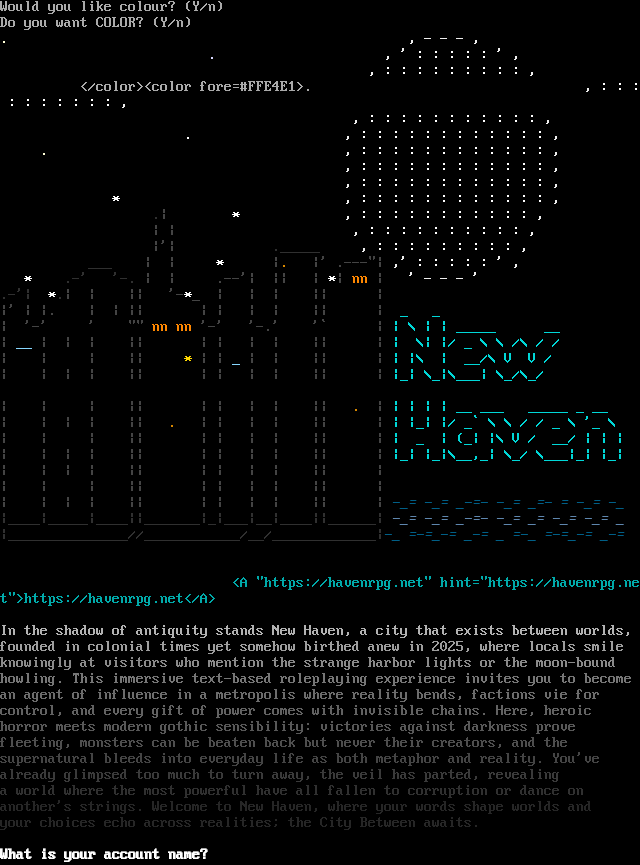 Would you like colour? (Y/n) Do you want COLOR? (Y/n) . , - - - , . , ' : : : : : ' , , : : : : : : : : : , </color><color fore=#FFE4E1>. , : : : : : : : : : : , , : : : : : : : : : : : , . , : : : : : : : : : : : : , . , : : : : : : : : : : : : , , : : : : : : : : : : : : , , : : : : : : : : : : : : , \* , : : : : : : : : : : : : , .\| \* , : : : : : : : : : : : , \| \| , : : : : : : : : : : , \|'\| .​_____ , : : : : : : : : : , ___ \| \| \* \|. \|' .​---"\| ,' : : : : : ' , \* .-' '-. \| \| .--'\| \|\| \| \*\| nn \| ' - - - ' .-'\| \*.\| \| \|\| '-\*_ \| \| \| \|\| \| \|' \| \|. \| \| \|\| \| \| \| \| \|\| \| _ _ \| '-' ' "" nn nn '-' '-.' '\` \| \| \\ \| \| _​____ __ \| __ \| \| \| \|\| \| \| \| \| \|\| \| \| \\\| \|/ _ \\ \\ /\\ / / \| \| \| \|\| \* \| \| _ \| \| \|\| \| \| \|\\ \| __/\\ V V / \| \| \| \| \|\| \| \| \| \| \|\| \| \|_\| \\_\|\\___\| \\_/\\_/ \| \| \| \|\| \| \| \| \| \|\| . \| \| \| \| \| __ ___ _​____ _ __ \| \| \| \| \|\| . \| \| \| \| \|\| \| \| \|_\| \|/ _\` \\ \\ / / _ \\ '_ \\ \| \| \| \|\| \| \| \| \| \|\| \| \| _ \| (_\| \|\\ V / __/ \| \| \| \| \| \| \| \|\| \| \| \| \| \|\| \| \|_\| \|_\|\\__,_\| \\_/ \\___\|_\| \|_\| \| \| \| \| \|\| \| \| \| \| \|\| \| \| \| \| \|\| \| \| \| \| \|\| \| \| \| \| \| \|\| \| \| \| \| \|\| \| -_= -_= _​-=- -_= _=- = -_= -_ \|_​___\|_​____\|_​___\|\|_​______\|_\|___\|__\|_​___\|\|_​_____\| -_= -_= _​-=- -_= _= -_= -_= _ \|_​______________//_​___________/__/_​____________\|-_ =​-=_-= _-= _ =-_ =​-=_-= _-= <A "https://havenrpg.net" hint="https://havenrpg.net">https://havenrpg.net</A> In the shadow of antiquity stands New Haven, a city that exists between worlds, founded in colonial times yet somehow birthed anew in 2025, where locals smile knowingly at visitors who mention the strange harbor lights or the moon-bound howling. This immersive text-based roleplaying experience invites you to become an agent of influence in a metropolis where reality bends, factions vie for control, and every gift of power comes with invisible chains. Here, heroic horror meets modern gothic sensibility: victories against darkness prove fleeting, monsters can be beaten back but never their creators, and the supernatural bleeds into everyday life as both metaphor and reality. You've already glimpsed too much to turn away, the veil has parted, revealing a world where the most powerful have all fallen to corruption or dance on another's strings. Welcome to New Haven, where your words shape worlds and your choices echo across realities; the City Between awaits. What is your account name?