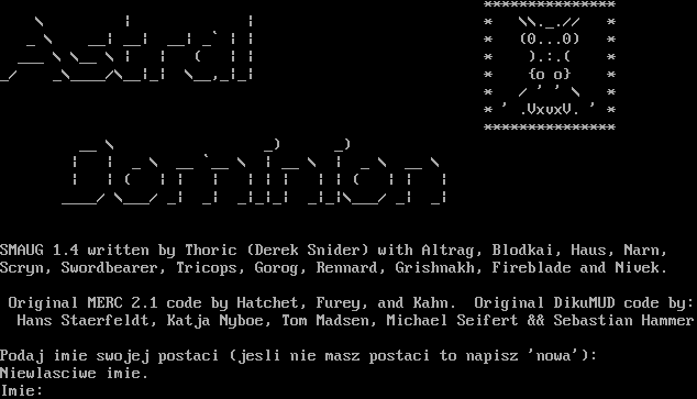 \*\*\*\*\*\*\*\*\*\*\*\*\*\*\* \\ \| \| \* \\\\._.// \* _ \\ __\| __\| __\| _\` \| \| \* (0...0) \* ___ \\ \\__ \\ \| \| ( \| \| \* ).:.( \* _/ _\\_​___/\\__\|_\| \\__,_\|_\| \* {o o} \* \* / ' ' \\ \* \* ' .VxvxV. ' \* \*\*\*\*\*\*\*\*\*\*\*\*\*\*\* __ \\ _) _) \| \| _ \\ __ \`__ \\ \| __ \\ \| _ \\ __ \\ \| \| ( \| \| \| \| \| \| \| \| ( \| \| \| _​___/ \\___/ _\| _\| _\|_\|_\| _\|_\|\\___/ _\| _\| SMAUG 1.4 written by Thoric (Derek Snider) with Altrag, Blodkai, Haus, Narn, Scryn, Swordbearer, Tricops, Gorog, Rennard, Grishnakh, Fireblade and Nivek. Original MERC 2.1 code by Hatchet, Furey, and Kahn. Original DikuMUD code by: Hans Staerfeldt, Katja Nyboe, Tom Madsen, Michael Seifert && Sebastian Hammer Podaj imie swojej postaci (jesli nie masz postaci to napisz 'nowa'): Niewlasciwe imie. Imie: