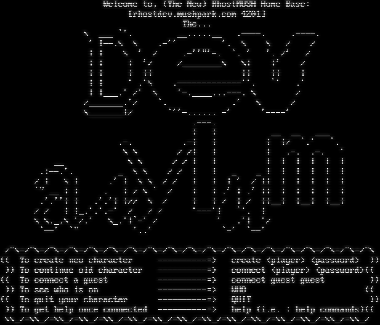 Welcome to, (The New) RhostMUSH Home Base: [rhostdev.mushpark.com 4201] The... \\ ___ \`'. _​_.....__ .​----. .​----. ' \|--.\\ \\ .-'' '. \\ \\ / / \| \| \\ ' / .-''"'-. \`. ' '. /' / \| \| \| '/ /_​_______\\ \\\| \|' / \| \| \| \|\| \|\| \|\| \| \| \| ' .'\\ .​-------------''. \`' .' \| \|_​__.' /' \\ '-​.____...---. \\ / /_​______.'/ \`. .' \\ / \\_​______\|/ \`''-​...... -' '-​---' .​---. \| \| __ __ ___ .-. .-\| \| \| \|/ \`.' \`. \\ \\ / /\| \| \| .-. .-. ' __ \\ \\ / / \| \| \| \| \| \| \| \| .:--.'. _ \\ \\ / / \| \| _ _ \| \| \| \| \| \| / \| \\ \| .' \| \\ \\ / / \| \| \| ' / \|\| \| \| \| \| \| \`" __ \| \| . \| / \\ \` / \| \| .' \| .' \|\| \| \| \| \| \| .'.''\| \| .'.'\| \|// \\ / \| \| / \| / \|\|__\| \|__\| \|__\| / / \| \|_.'.'.-' / / / '---'\| \`'. \| \\ \\._,\\ '/.' \\_.'\|\`-' / ' .'\| '/ \`--' \`" '..' \`-' \`--' /~\\=/~\\=/~\\=/~\\=/~\\=/~\\=/~\\=/~\\=/~\\=/~\\=/~\\=/~\\=/~\\=/~\\=/~\\=/~\\=/~\\=/~\\=/~\\ (( To create new character -​---------=> create <player> <password> )) )) To continue old character -​---------=> connect <player> <password>(( (( To connect a guest -​---------=> connect guest guest )) )) To see who is on -​---------=> WHO (( (( To quit your character -​---------=> QUIT )) )) To get help once connected -​---------=> help (i.e. : help commands)(( \\\\_/=\\\\_/=\\\\_/=\\\\_/=\\\\_/=\\\\_/=\\\\_/=\\\\_/=\\\\_/=\\\\_/=\\\\_/=\\\\_/=\\\\_/=\\\\_/=\\\\_/
