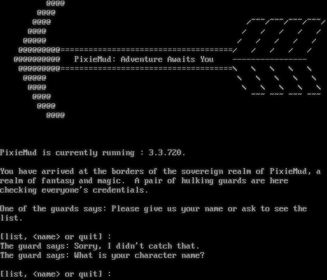 @@@@ @@@@ @@@@ /~~~/~~~/~~~/~~~/ @@@@ / / / / / @@@@@ / / / / / @@@@@@@@@=​====================================/ / / / / @@@@@@@@@@ PixieMud: Adventure Awaits You -​--------------- @@@@@@@@@=​====================================\\ \\ \\ \\ \\ @@@@@ \\ \\ \\ \\ \\ @@@@ \\ \\ \\ \\ \\ @@@@ ~~~ ~~~ ~~~ ~~~ @@@@ @@@@ PixieMud is currently running : 3.3.720. You have arrived at the borders of the sovereign realm of PixieMud, a realm of fantasy and magic. A pair of hulking guards are here checking everyone's credentials. One of the guards says: Please give us your name or ask to see the list. [list, <name> or quit] : The guard says: Sorry, I didn't catch that. The guard says: What is your character name? [list, <name> or quit] :
