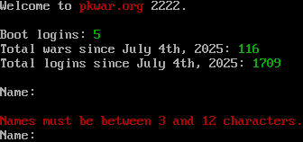 Welcome to pkwar.org 2222. Boot logins: 5 Total wars since July 4th, 2025: 116 Total logins since July 4th, 2025: 1709 Name: Names must be between 3 and 12 characters. Name: