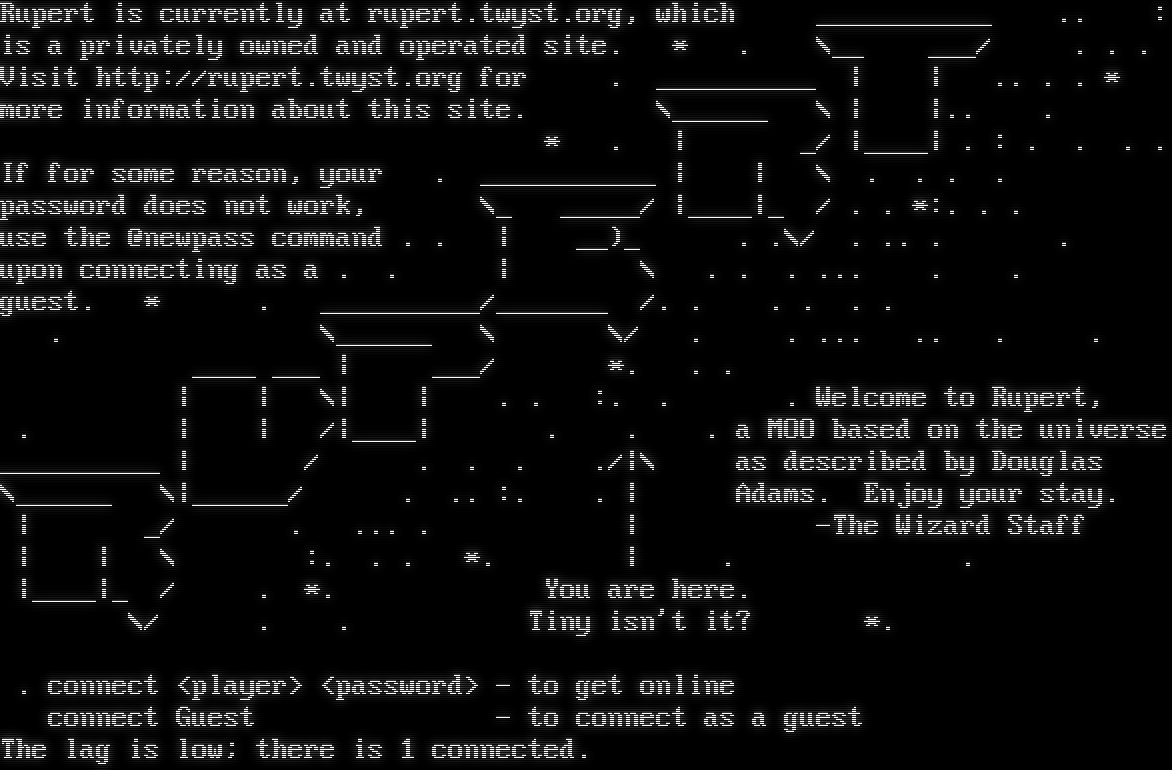 Rupert is currently at rupert.twyst.org, which _​__________ .. : is a privately owned and operated site. \* . \\__ ___/ . . . Visit http://rupert.twyst.org for . _​_________ \| \| .. . . \* more information about this site. \\_​_____ \\ \| \|.. . \* . \| _/ \|_​___\| . : . . . . If for some reason, your . _​__________ \| \| \\ . . . . password does not work, \\_ _​____/ \|_​___\|_ / . . \*:. . . use the @newpass command . . \| __)_ . .\\/ . .. . . upon connecting as a . . \| \\ . . . ... . . guest. \* . _​_________/_​______ /. . . . . . . \\_​_____ \\ \\/ . . ... .. . . _​___ ___ \| ___/ \*. . . \| \| \\\| \| . . :. . . Welcome to Rupert, . \| \| /\|_​___\| . . . a MOO based on the universe _​_________ \| / . . . ./\|\\ as described by Douglas \\_​_____ \\\|_​_____/ . .. :. . \| Adams. Enjoy your stay. \| _/ . ... . \| -The Wizard Staff \| \| \\ :. . . \*. \| . . \|_​___\|_ / . \*. You are here. \\/ . . Tiny isn't it? \*. . connect <player> <password> - to get online connect Guest - to connect as a guest The lag is low; there is 1 connected.