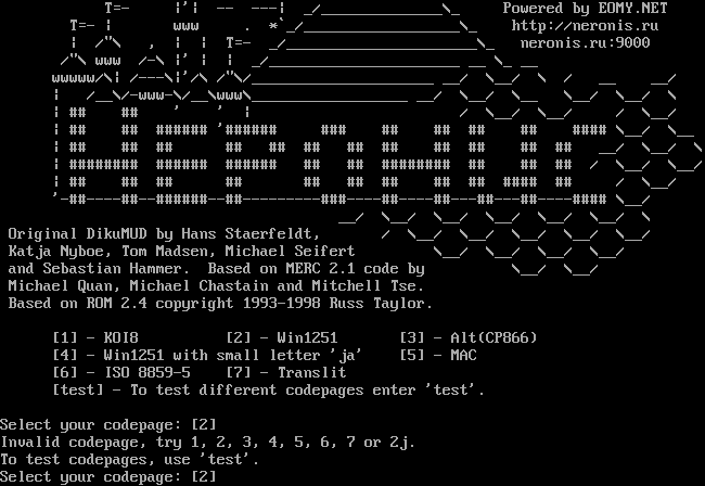 Welcome to... . . __ T=- \`. \* \| _/__\\_ \| \`. ._\|_\* _/_​_____\\_ /"\\ . \* . _/_​_________\\_ T=- \|'\| -- ---\| _/_​_____________\\_ Powered by EOMY.NET T=- \| www . \*\`_/_​_________________\\_ http://neronis.ru \| /"\\ , \| \| T=- _/_​_____________________\\_ neronis.ru:9000 /"\\ www /-\\ \|' \| \| _/_​_____________________ __ \\_ __ wwwww/\\\| /---\\\|'/\\ /"\\/_​____________________ __/ \\__/ \\ / __ __/ \| /__\\/-www-\\/__\\www\\_​_________________ __/ \\__/ \\__ \\__/ \\__/ \\ \| ## ## ' ' \| / \\__/ \\__/ / \\__/ \| ## ## #​##### '#​##### ### ## ## ## ## #​### \\__/ \\__ \| ## ## ## ## ## ## ## ## ## ## ## ## __/ \\__/ \\ \| #​####### #​##### #​##### ## ## #​####### ## ## ## / \\__/ \\__/ \| ## ## ## ## ## ## ## ## ## #​### ## / \\__/ '-​##----##--######--##---------###----##----##---##---##----#### \\__/ __/ \\__/ \\__/ \\__/ \\__/ \\__/ \\ Original DikuMUD by Hans Staerfeldt, / \\__/ \\__/ \\__/ \\__/ \\__/ Katja Nyboe, Tom Madsen, Michael Seifert \\__/ \\__/ \\__/ \\__/ and Sebastian Hammer. Based on MERC 2.1 code by \\__/ \\__/ Michael Quan, Michael Chastain and Mitchell Tse. Based on ROM 2.4 copyright 1993-1998 Russ Taylor. [1] - KOI8 [2] - Win1251 [3] - Alt(CP866) [4] - Win1251 with small letter 'ja' [5] - MAC [6] - ISO 8859-5 [7] - Translit [test] - To test different codepages enter 'test'. Select your codepage: [2] Invalid codepage, try 1, 2, 3, 4, 5, 6, 7 or 2j. To test codepages, use 'test'. Select your codepage: [2]