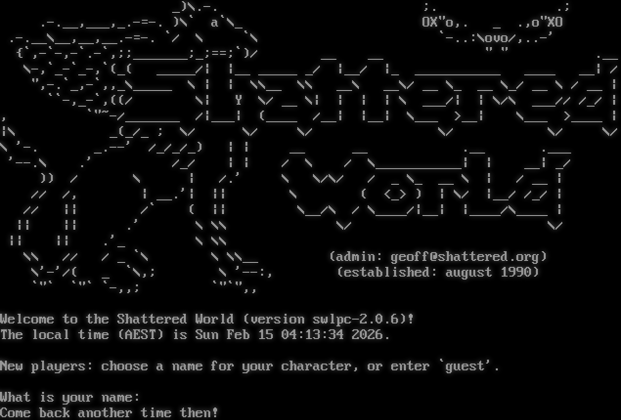 _)\\.-. ;. .; .​-.__,___,_​.-=-. )\\\` a\`\\_ OX"o,. _ .,o"XO .​-.__\\__,__,_​_.-=-. \`/ \\ \`\\ \`-..:\\ovo/,..-' {\`,-\`-,-\`.-\`,;;_​______;_;==;\`)/ __ __ " " .__ \\-,\`_-\`_-,\`(_( _​____/\| \|__ _​____ _/ \|__/ \|_ _​__________ _​___ __\| / ",-.\`_,-\`,,_\\_​____ \\ \| \| \\\\__ \\\\ __\\ __\\/ __ \\_ __ \\_/ __ \\ / __ \| \`\`-,_-\`,((/ \\\| Y \\/ __ \\\| \| \| \| \\ ___/\| \| \\/\\ ___// /_/ \| , \`"~-/_​______ /\|___\| (_​___ /__\| \|__\| \\___ >__\| \\___ >_​___ \| \|\\ _(_/_ ; \\/ \\/ \\/ \\/ \\/ \\/ \\ '-. _​.--' /_/_/_) \| \| __ __ .__ .​___ '--.\\ .' /_/ \| \| / \\ / \\_​__________\| \| __\| _/ )) / \\ \| /.' \\ \\/\\/ / _ \\_ __ \\ \| / __ \| // /, \| __.'\| \|\| \\ ( <_> ) \| \\/ \|__/ /_/ \| // \|\| /\` ( \|\| \\__/\\ / \\_​___/\|__\| \|_​___/\\_​___ \| \|\| \|\| .' \\ \\\\ \\/ \\/ \|\| \|\| .'_ \\ \\\\ \\\\ // / _ \`\\ \\ \\\\__ (admin: geoff@shattered.org) \\'-'/( _ \`\\,; \\ '--:, (established: august 1990) \`"\` \`"\` \`-,,; \`"\`",, Welcome to the Shattered World (version swlpc-2.0.6)! The local time (AEST) is Sun Feb 15 04:13:34 2026. New players: choose a name for your character, or enter \`guest'. What is your name: Come back another time then!