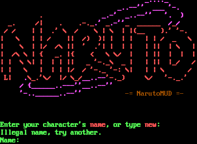 _​...._ _​..--'' ___ '-. . _.-' _​..--'' '. ) _. /\| . .​-._.' _.-''_ _​_____ /_/ / / \| \| .' \\ / \\ \| \\ \| \|(__ ).' '-. \| \\ \| \| / \|\| /) )\| \| \| \| \| \| / _ \\ \| \\ \| \|/ /\\ \|\| ' .'\| \| \| \| \| \|\| \| \\ \| \| /\\ \\ \| { _. \|{ < \\ \\/ \| \| \|\| \| \| \| \| \| \\ \\\| \| \| \| \|\| _ '-._\\ _ \| \| \|\| \|_/ / \| \| \\ \| \| \| \|/ / '-._ '-: \\\| \| \| \\ / L\| .\\_.'\\/ \|/ \\_/_​_..--'-._) \\/ '-​._.' / {_​_____..---''_​_..--'' '-​..______..--'' -= NarutoMUD =- Enter your character's name, or type new: Illegal name, try another. Name: