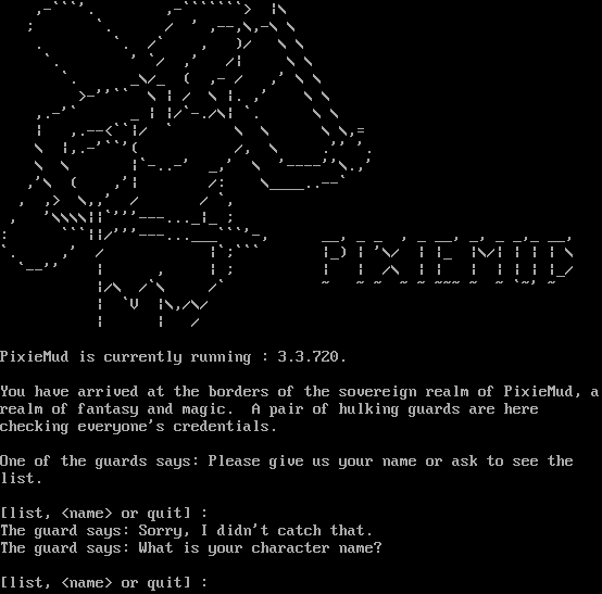 ,-\`\`\`'. ,-\`\`\`\`\`\`\`> \|\\ ; \`. / ' ,--,\\,-\\ \\ . \`. /\` , )/ \\ \\ \`. ' \`/ ,' /\| \\ \\ \`. _\\/_ ( ,- / ,' \\ \\ >-''\`\` \\ \| / \\ \|. ,' \\ \\ ,.-'\` _ \| \|/\`-./\\\| \`. \\ \\ \| ,.--<\`\`\|/ \` \\ \\ \\ \\,= \\ \|,.-'\`\`'( /, \\ .'' '. \\ \\ \|\`-​..-' _,' \\ '-​---''\\.,' ,'\\ ( ,'\| /: \\_​___..--\` , ,> \\,,' / / \`, , '\\\\\\\\\|\|\`'''-​--..._\|_ ; : \`\`\`\|\|/'''-​--...___\`\`\`'-, __, _ _ , _ __, _, _ _,_ __, \`. ,' / \|\`;\`\`\` \|_) \| '\\/ \| \|_ \|\\/\| \| \| \| \\ \`--'' \| , \| ; \| \| /\\ \| \| \| \| \| \| \|_/ \|/\\ /\`\\ /\` ~ ~ ~ ~ ~ ~~~ ~ ~ \`~' ~ \| \`V \|\\,/\\/ \| \| / PixieMud is currently running : 3.3.720. You have arrived at the borders of the sovereign realm of PixieMud, a realm of fantasy and magic. A pair of hulking guards are here checking everyone's credentials. One of the guards says: Please give us your name or ask to see the list. [list, <name> or quit] : The guard says: Sorry, I didn't catch that. The guard says: What is your character name? [list, <name> or quit] :