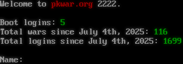 Welcome to pkwar.org 2222. Boot logins: 5 Total wars since July 4th, 2025: 116 Total logins since July 4th, 2025: 1699 Name: