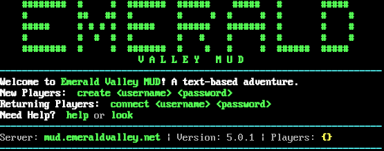#​####### # # #​###### #​##### #​#### # #​#### # ## ## # # # # # # # # #​#### # # # # #​#### #​##### #​###### # # # # # # # # # # # # # # # #​####### # # #​###### # # # # #​##### #​#### V A L L E Y M U D -​-------------------------------------------------------------------- Welcome to Emerald Valley MUD! A text-based adventure. New Players: create &lt;username&gt; &lt;password&gt; Returning Players: connect &lt;username&gt; &lt;password&gt; Need Help? help or look -​-------------------------------------------------------------------- Server: mud.emeraldvalley.net \| Version: 5.0.1 \| Players: {} -​--------------------------------------------------------------------