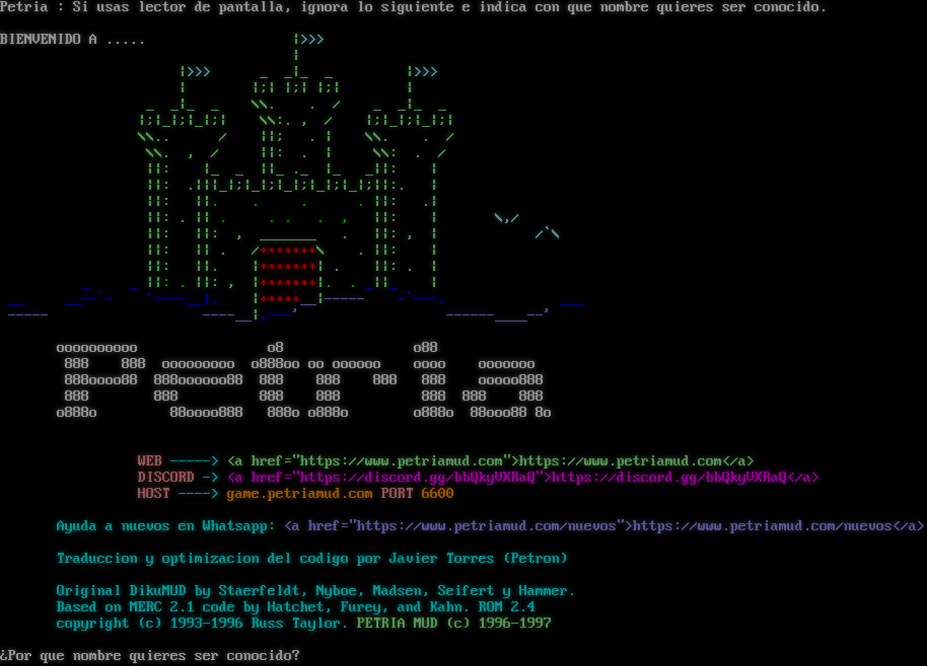 Petria : Si usas lector de pantalla, ignora lo siguiente e indica con que nombre quieres ser conocido. BIENVENIDO A .​.... \|>>> \| \|>>> _ _\|_ _ \|>>> \| \|;\| \|;\| \|;\| \| _ _\|_ _ \\\\. . / _ _\|_ _ \|;\|_\|;\|_\|;\| \\\\:. , / \|;\|_\|;\|_\|;\| \\\\.. / \|\|; . \| \\\\. . / \\\\. , / \|\|: . \| \\\\: . / \|\|: \|_ _ \|\|_ ._ \|_ _\|\|: \| \|\|: .\|\|\|_\|;\|_\|;\|_\|;\|_\|;\|_\|;\|\|:. \| \|\|: \|\|. . . . \|\|: .\| \|\|: . \|\| . . . . , \|\|: \| \\,/ \|\|: \|\|: , _​______ . \|\|: , \| /\`\\ \|\|: \|\| . /+​++++++\\ . \|\|: \| \|\|: \|\|. \|+​++++++\| . \|\|: . \| _ _ \|\|: . \|\|: , \|+​++++++\|. . _\|\|_ \| __ _​_--\`- '-​---__\|. \|+​++++__\|-​---- -\`---, ___ -​---- -​---__\|,---' -​-----____--' oooooooooo o8 o88 888 888 ooooooooo o888oo oo oooooo oooo ooooooo 888oooo88 888oooooo88 888 888 888 888 ooooo888 888 888 888 888 888 888 888 o888o 88oooo888 888o o888o o888o 88ooo88 8o WEB -​----> <a href="https://www.petriamud.com">https://www.petriamud.com</a> DISCORD -> <a href="https://discord.gg/bbQkyVXRaQ">https://discord.gg/bbQkyVXRaQ</a> HOST -​---> game.petriamud.com PORT 6600 Ayuda a nuevos en Whatsapp: <a href="https://www.petriamud.com/nuevos">https://www.petriamud.com/nuevos</a> Traduccion y optimizacion del codigo por Javier Torres (Petron) Original DikuMUD by Staerfeldt, Nyboe, Madsen, Seifert y Hammer. Based on MERC 2.1 code by Hatchet, Furey, and Kahn. ROM 2.4 copyright (c) 1993-1996 Russ Taylor. PETRIA MUD (c) 1996-1997 ¿Por que nombre quieres ser conocido?