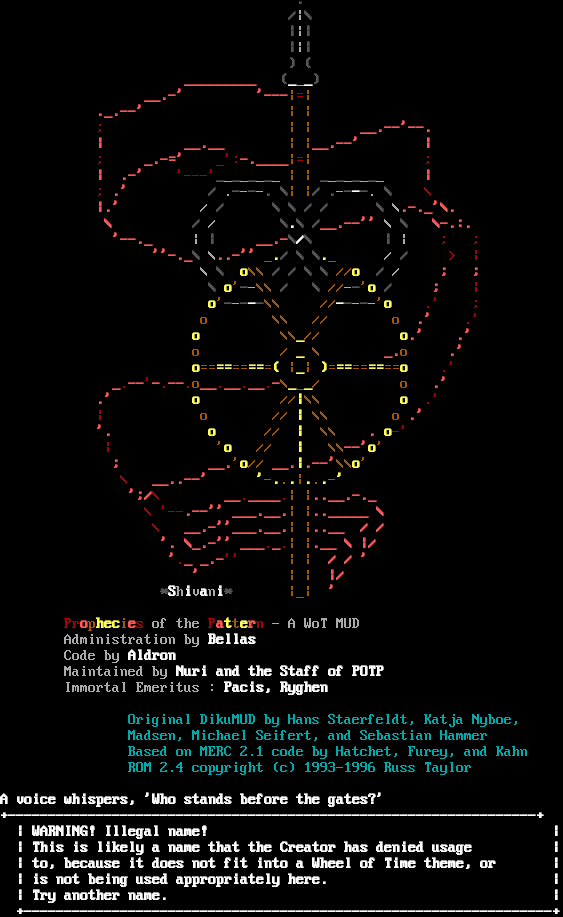 . /\|\\ \|\|\| \|\|\| ) ( _​________ (___) _​_.-' '---\|=\| .​_.--' \| \| ; \| \| _​_.--'--. \| _​_.__ \| \|_​_.--' \| ; _​.-=' _':-​.____\|=\| ; \| .-' '---'_​_______ \| \| _​_______ \| ; .' / .​----. \\\| \|/ .​----. \\ \\ \|.' / / \\ \\ / / \\ \\.​-._'\\. \\ / / \\.\\ /_​_.--'' \\ \\ \\-.:. '-​-._ \| \| _​_.-\\/\\ \| \| ; ; ''-._\\ \\..-'' _./ \\ \\._ / / > \| \\ \\ o\\\\ / / \\ \\ //o / / ; ; \\ o'--\\\\ / \\ //--'o / ; \| o'-​----\\\\ //-​----'o .' ; o \\\\ // o .' .' o \\\\_// o.' .' o / _ \\ _.o .' o=​========( \|_\| )=​========o .' _​.--'-​.--.o_​_.__.__.-\\___/ o .' .' o //\|\\\\ o .' \| o // \| \\\\ o .' '. o // \| \\\\ . o-' \| 'o // \| \\\\--'o' ; __.'o// __.\|.--'\\\\o' \\ _​_..--' '-​...\|.​..-' ';/\\ _​_.____.\| \|.​.__.-._ \\ '-​-.--'' _​__.__.\| \|.​._____ \\ \\ _​_.-''_​__.__.\| \|.​.__ / / '. \\_.-'' _​__._.\| \|.__ \\ \|/ '._ _.-'' \| \| / / ' ' \| \| \|/ \*Shivani\* \|_\| ' Prophecies of the Pattern - A WoT MUD Administration by Bellas Code by Aldron Maintained by Nuri and the Staff of POTP Immortal Emeritus : Pacis, Ryghen Original DikuMUD by Hans Staerfeldt, Katja Nyboe, Madsen, Michael Seifert, and Sebastian Hammer Based on MERC 2.1 code by Hatchet, Furey, and Kahn ROM 2.4 copyright (c) 1993-1996 Russ Taylor A voice whispers, 'Who stands before the gates?' +​------------------------------------------------------------------+ \| WARNING! Illegal name! \| \| This is likely a name that the Creator has denied usage \| \| to, because it does not fit into a Wheel of Time theme, or \| \| is not being used appropriately here. \| \| Try another name. \| +​------------------------------------------------------------------+