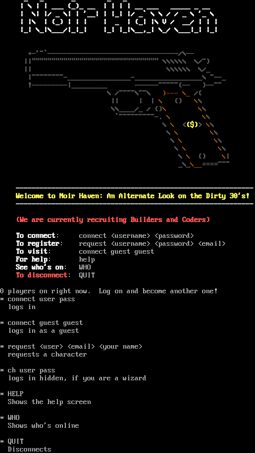 _ _ _ _ _ \| \\ \| \| ___ (_)_ __ \| \| \| \| __ ___ _​____ _ __ \| \\\| \|/ _ \\\| \| '__\| \| \|_\| \|/ _\` \\ \\ / / _ \\ '_ \\ \| \|\\ \| (_) \| \| \| \| _ \| (_\| \|\\ V / __/ \| \| \| \|_\| \\_\|\\___/\|_\|_\| \|_\| \|_\|\\__,_\| \\_/ \\___\|_\| \|_\| +-'~\`-​--------------------------------/\\-- \|\|"​""""""""""""""""""""""""""""""" \\\\\\\\\\\\ \\/~) \|\| \\\\\\\\\\\\ \\/_ \|~​~~~~~~~-________________-_________________\\ ~​--_ !-​--------\|_​________ -​-----~~~~~(-- )-​-~~ \\ /~​~~~\\~~\\ )--- \\_ /( \|\| \| \| \\ () \\\\ \\\\_​___/_ / ()\\ \\\\ \`~​~~~~~~~~-. \\ \\\\ \\ \\ <($)> \\\\ \\ \\ \\\\ \\ \\ \\\\ \\ \\ \\\\ \\ \\ () \\\| _\\_\\_​_====~~~ -​----------------------------------------------------------- Welcome to Noir Haven: An Alternate Look on the Dirty 30's! -​----------------------------------------------------------- (We are currently recruiting Builders and Coders) To connect: connect <username> <password> To register: request <username> <password> <email> To visit: connect guest guest For help: help See who's on: WHO To disconnect: QUIT 0 players on right now. Log on and become another one! \* connect user pass logs in \* connect guest guest logs in as a guest \* request <user> <email> <your name> requests a character \* ch user pass logs in hidden, if you are a wizard \* HELP Shows the help screen \* WHO Shows who's online \* QUIT Disconnects