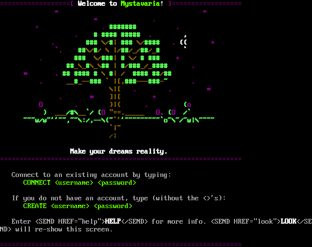 =​=================[ Welcome to Mystavaria! ]=​================= \* \* \* . + . #​###### . . # #​### #​#### . , . ### \\/#\| ### \\/#​### . (( + \`. ##\\/#/ \\ \|/##/_/##/_# \` . ### \\/###\| # \\/ # ### + ##_\\_#\\_\\## \| #/#​##_/_​#### . \* . ## #​### # \\ #\| / #​### ##/## . _​_#_--### \` \|[,#​##---###-~ . \\\|[ . . \* . \* ]\|[ + O . )\|( . (o ) ___/#\\__\`/ (O "​==._____ O, (O /\` ~~~w/w~''~~,~~\\:/,--\\(~\`''~​~~~~~~~~\`o~\\~/~w\|\\~​~~~ \`\|~ /\| Make your dreams reality. =​============================================================= Connect to an existing account by typing: CONNECT &lt;username&gt; &lt;password&gt; If you do not have an account, type (without the &lt;&gt;'s): CREATE &lt;username&gt; &lt;password&gt; Enter <SEND HREF="help">HELP</SEND> for more info. <SEND HREF="look">LOOK</SEND> will re-show this screen. =​=============================================================