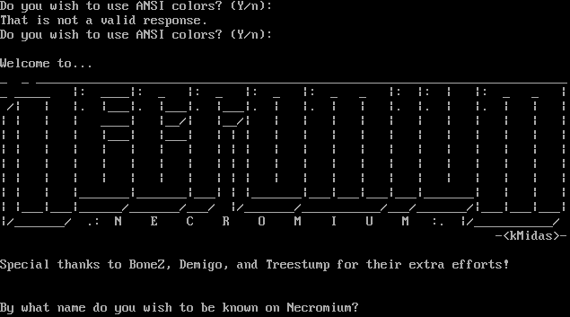 Do you wish to use ANSI colors? (Y/n): That is not a valid response. Do you wish to use ANSI colors? (Y/n): Welcome to... _ _ _​_________________________________________________________________________ _ _​____ \|: _​___\|: _ \|: _ \|: _ \|: _ _ \|: \|: \| \|: _ _ \| /\| \| \|. \|___\|. \|___\|. \|___\|. \| \|. \| \| \|. \|. \| \|. \| \| \| \| \| \| \| _​___\| \|__/\| \|__/\| \| \| \| \| \| \| \| \| \| \| \| \| \| \| \| \|___\| \|___\| \| \| \| \| \| \| \| \| \| \| \| \| \| \| \| \| \| \| \| \| \| \| \| \| \| \| \| \| \| \| \| \| \| \| \| \| \| \| \| \| \| \| \| \| \| \| \| \| \| \| \| \| \| \| \| \| \| \| \| \| \| \| \| \| \| \| \| \| \| \| \| \| \| \| \| \| \| \| \| \| \| \| \| \|_​______\|_​______\|___\| \| \|_​______\|___\|___\|___\|___\|_​______\| \| \| \| \| \|___\|___\|_​_____/_​______/___/ \|/_​______/_​__________/___/_​______/\|___\|___\|___\| \|/_​______/ .: N E C R O M I U M :. \|/_​__________/ -<kMidas>- Special thanks to BoneZ, Demigo, and Treestump for their extra efforts! By what name do you wish to be known on Necromium?