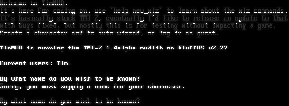 Welcome to TimMUD. It's here for coding on, use 'help new_wiz' to learn about the wiz commands. It's basically stock TMI-2, eventually I'd like to release an update to that with bugs fixed, but mostly this is for testing without impacting a game. Create a character and be auto-wizzed, or log in as guest. TimMUD is running the TMI-2 1.4alpha mudlib on FluffOS v2.27 Current users: Tim. By what name do you wish to be known? Sorry, you must supply a name for your character. By what name do you wish to be known?