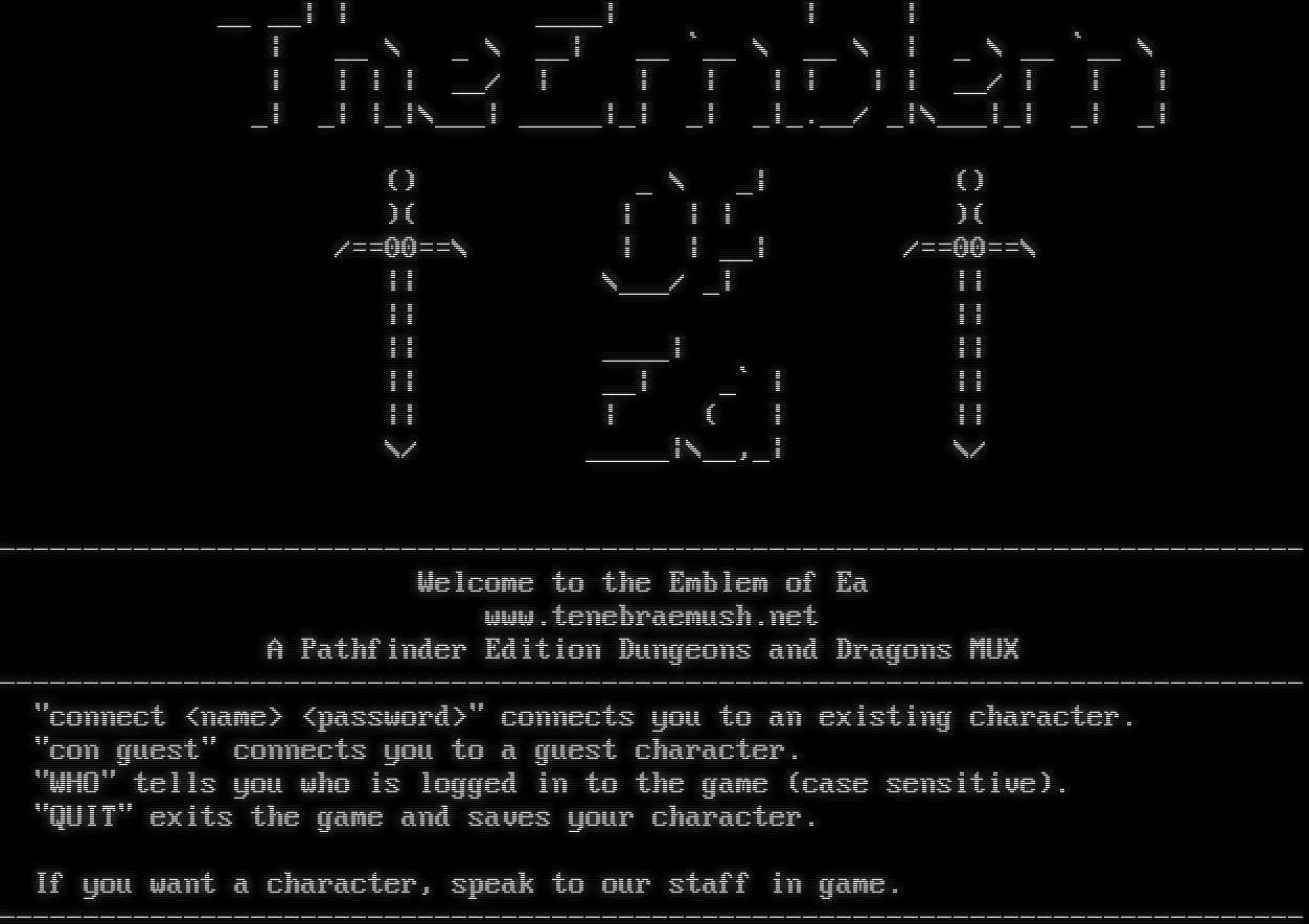__ __\| \| _โ€‹___\| \| \| \| __ \\ _ \\ __\| __ \`__ \\ __ \\ \| _ \\ __ \`__ \\ \| \| \| \| __/ \| \| \| \| \| \| \| __/ \| \| \| _\| _\| \|_\|\\___\| _โ€‹____\|_\| _\| _\|_โ€‹.__/ _\|\\___\|_\| _\| _\| () _ \\ _\| () )( \| \| \| )( /==00==\\ \| \| __\| /==00==\\ \|\| \\___/ _\| \|\| \|\| \|\| \|\| _โ€‹___\| \|\| \|\| __\| _\` \| \|\| \|\| \| ( \| \|\| \\/ _โ€‹____\|\\__,_\| \\/ -โ€‹----------------------------------------------------------------------------- Welcome to the Emblem of Ea www.tenebraemush.net A Pathfinder Edition Dungeons and Dragons MUX -โ€‹----------------------------------------------------------------------------- "connect <name> <password>" connects you to an existing character. "con guest" connects you to a guest character. "WHO" tells you who is logged in to the game (case sensitive). "QUIT" exits the game and saves your character. If you want a character, speak to our staff in game. -โ€‹-----------------------------------------------------------------------------