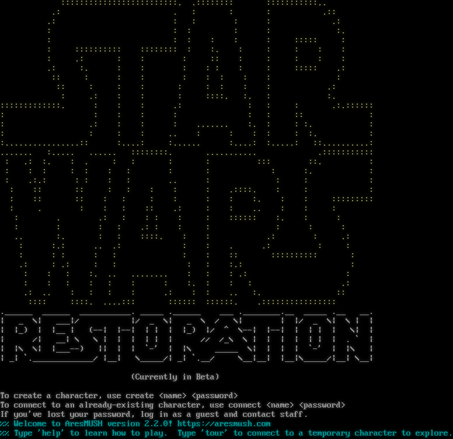 :::::::::::::::::::::::::. .:::::::: :::::::::::.. .: . : : : .:: .: : : : : .: : : : : : :. : : : : : : ::::: : : :::::::::: :::::::: : :. : : : : : : .: : : : :: : : : : : .: :. : : : : : : : ::::: .: :: : : : : : : : : : :: : : : : : : : : .: : .: : : : ::::. :. : :. :::::::::::::. : : : .: : : : .:.:::::: : : : : : : : :: : : .: : : : .โ€‹...... :. : : :. : : : : : .. : : : : : :. : :.โ€‹...............:: :.โ€‹...: :.โ€‹..... :.โ€‹...: :.โ€‹....: ::.โ€‹.........: .โ€‹...... :.โ€‹.... .โ€‹..... ::::::::. .โ€‹.......... .::::::::::: : .: :. : . : : : : ::: ::. : : : : : : : : : : : :. : : .:.: : : : : .. : : : : : :: :: : : : : : .::::. : : : : :: :: : : : : : : :. : : ::::::::: : . : : : :: .: : : .. : : : : . .: : : : : : :::::: :. : : : : : : .: : : : : : : .. :. : : ::::. : : .: : .: : :.: .. .: : : . .: : : : : : : : : : :: :::::::::: : .: : .: : : : : :.: : : : : :. .. .โ€‹....... : : : .: : : : : : : : : :. : : : .: .: .. : : : : .: : : .. :. :: :::: ::::. .โ€‹...::: :::::: ::::::. .:::::::::::::::: .โ€‹______ _โ€‹_____ _โ€‹__________. _โ€‹____ .โ€‹______ ___ .โ€‹________.__ _โ€‹____ .__ __. \| _ \\\| ___\|/ \|/ _ \\\| _ \\ / \\\| \| \|/ _ \\\| \\ \| \| \| \|_) \| \|__ \| (--\| \|--\| \| \| \| \|_) \|/ ^ \\--\| \|--\| \| \| \| \| \\\| \| \| /\| __\| \\ \\ \| \| \| \| \| \| // /_\\ \\ \| \| \| \| \| \| \| . \` \| \| \|\\ \\\| \|_โ€‹__--) \|\| \| \| \`-' \| \|\\ _โ€‹____ \\\| \| \| \| \`-' \| \|\\ \| \| _\| \`.โ€‹_____________/ \|__\| \\_โ€‹____/\| _\| \`.__/ \\__\|__\| \|__\|\\_โ€‹____/\|__\| \\__\| (Currently in Beta) To create a character, use create <name> <password> To connect to an already-existing character, use connect <name> <password> If you've lost your password, log in as a guest and contact staff. %% Welcome to AresMUSH version 2.2.0! https://aresmush.com %% Type 'help' to learn how to play. Type 'tour' to connect to a temporary character to explore.