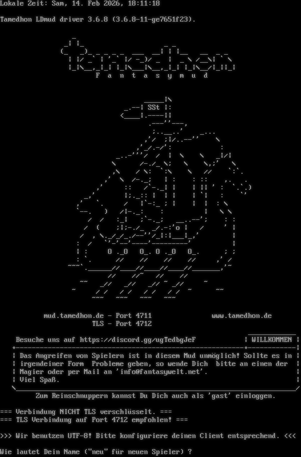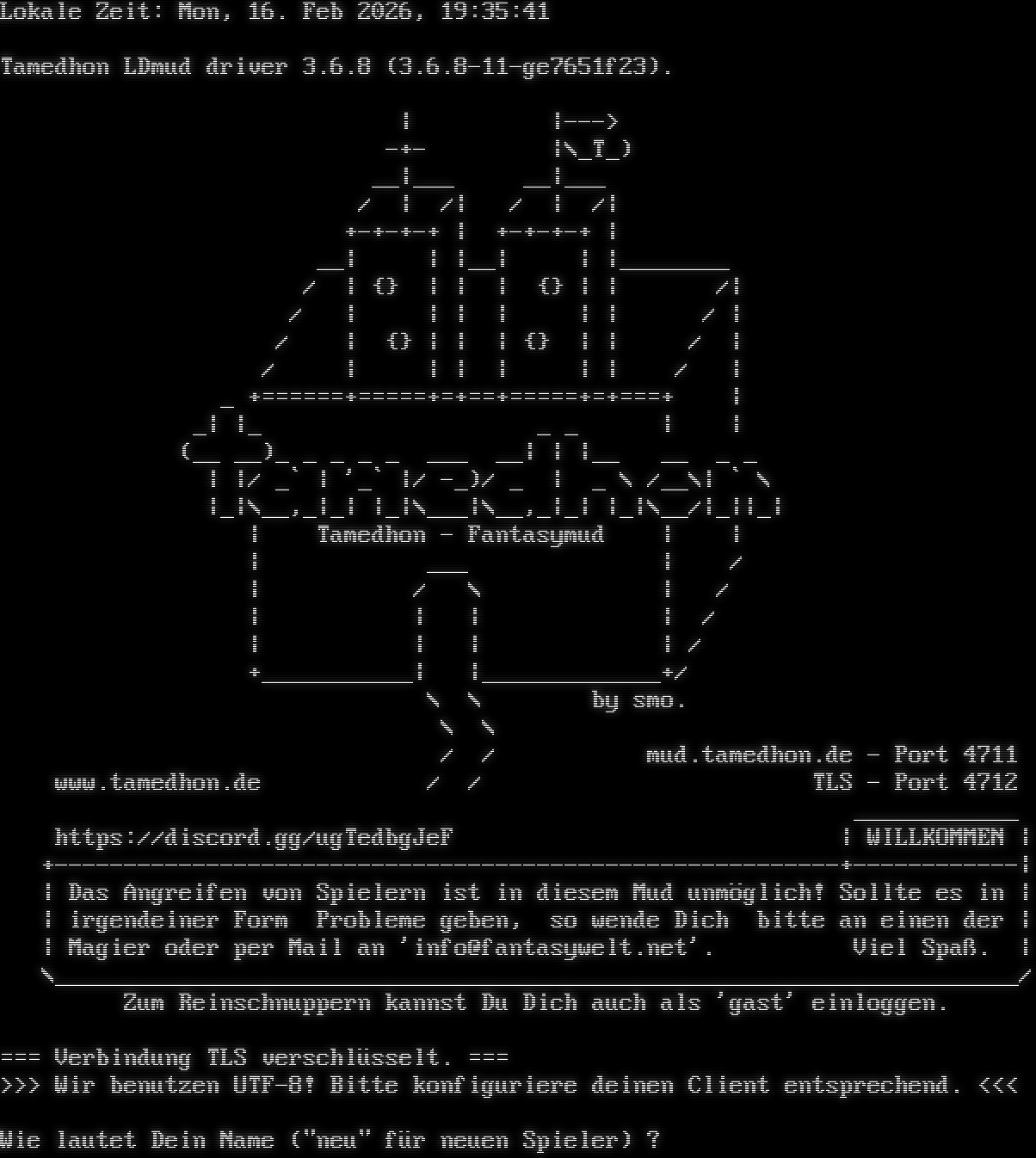 Lokale Zeit: Mon, 16. Feb 2026, 19:35:41 Tamedhon LDmud driver 3.6.8 (3.6.8-11-ge7651f23). \| \|---> -+- \|\\_T_) __\|___ __\|___ / \| /\| / \| /\| +โ€‹-+-+-+ \| +โ€‹-+-+-+ \| __\| \| \|__\| \| \|_โ€‹_______ / \| {} \| \| \| {} \| \| /\| / \| \| \| \| \| \| / \| / \| {} \| \| \| {} \| \| / \| / \| \| \| \| \| \| / \| _ +โ€‹======+=====+=+==+=====+=+===+ \| _\| \|_ _ _ \| \| (__ __)_ _ _ _ _ ___ __\| \| \|__ __ _ _ \| \|/ _\` \| '_\` \|/ -_)/ _ \| _ \\ /__\\\| \` \\ \|_\|\\__,_\|_\| \|_\|\\___\|\\__,_\|_\| \|_\|\\__/\|_\|\|_\| \| Tamedhon - Fantasymud \| \| \| ___ \| / \| / \\ \| / \| \| \| \| / \| \| \| \| / +โ€‹___________\| \|_โ€‹____________+/ \\ \\ by smo. \\ \\ / / mud.tamedhon.de - Port 4711 www.tamedhon.de / / TLS - Port 4712 _โ€‹___________ https://discord.gg/ugTedbgJeF \| WILLKOMMEN \| +โ€‹---------------------------------------------------------+------------\| \| Das Angreifen von Spielern ist in diesem Mud unmรถglich! Sollte es in \| \| irgendeiner Form Probleme geben, so wende Dich bitte an einen der \| \| Magier oder per Mail an 'info@fantasywelt.net'. Viel SpaรŸ. \| \\_โ€‹_____________________________________________________________________/ Zum Reinschnuppern kannst Du Dich auch als 'gast' einloggen. === Verbindung TLS verschlรผsselt. === >>> Wir benutzen UTF-8! Bitte konfiguriere deinen Client entsprechend. <<< Wie lautet Dein Name ("neu" fรผr neuen Spieler) ?
