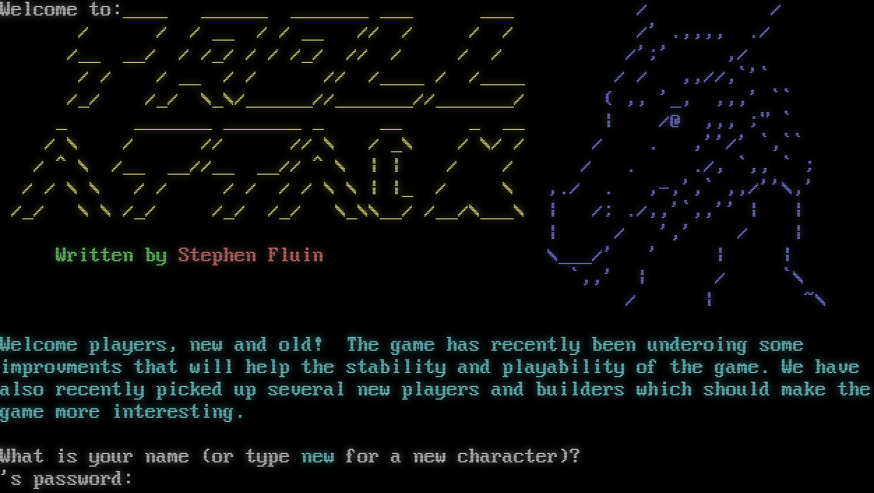 Welcome to:_โ€‹___ _โ€‹_____ _โ€‹______ ___ ___ / / / / / __ / / __ // / / / /' .,,,, ./ /__ __/ / /_/ / / /_/ // / / / /';' ,/ / / / __ / / // /_โ€‹___ / /_โ€‹___ / / ,,//,\`'\` /_/ /_/ \\_\\/_โ€‹_____//_โ€‹______//_โ€‹______/ ( ,, '_, ,,,' \`\` _ _โ€‹______ _โ€‹______ _ __ _ __ \| /@ ,,, ;" \` / \\ / // // \\ / _\\ / \\/ / / . ,''/' \`,\`\` / ^ \\ /__ __//__ __// ^ \\ \| \| / / / . ./, \`,, \` ; / / \\ \\ / / / / / / \\ \\ \| \|_ / \\ ,./ . ,-,',\` ,,/''\\,' /_/ \\ \\ /_/ /_/ /_/ \\_\\\\__/ /__/\\___\\ \| /; ./,,'\`,,'' \| \| \| / ',' / \| Written by Stephen Fluin \\___/' ' \| \| \`,,' \| / \`\\ / \| ~\\ Welcome players, new and old! The game has recently been underoing some improvments that will help the stability and playability of the game. We have also recently picked up several new players and builders which should make the game more interesting. What is your name (or type new for a new character)? 's password: