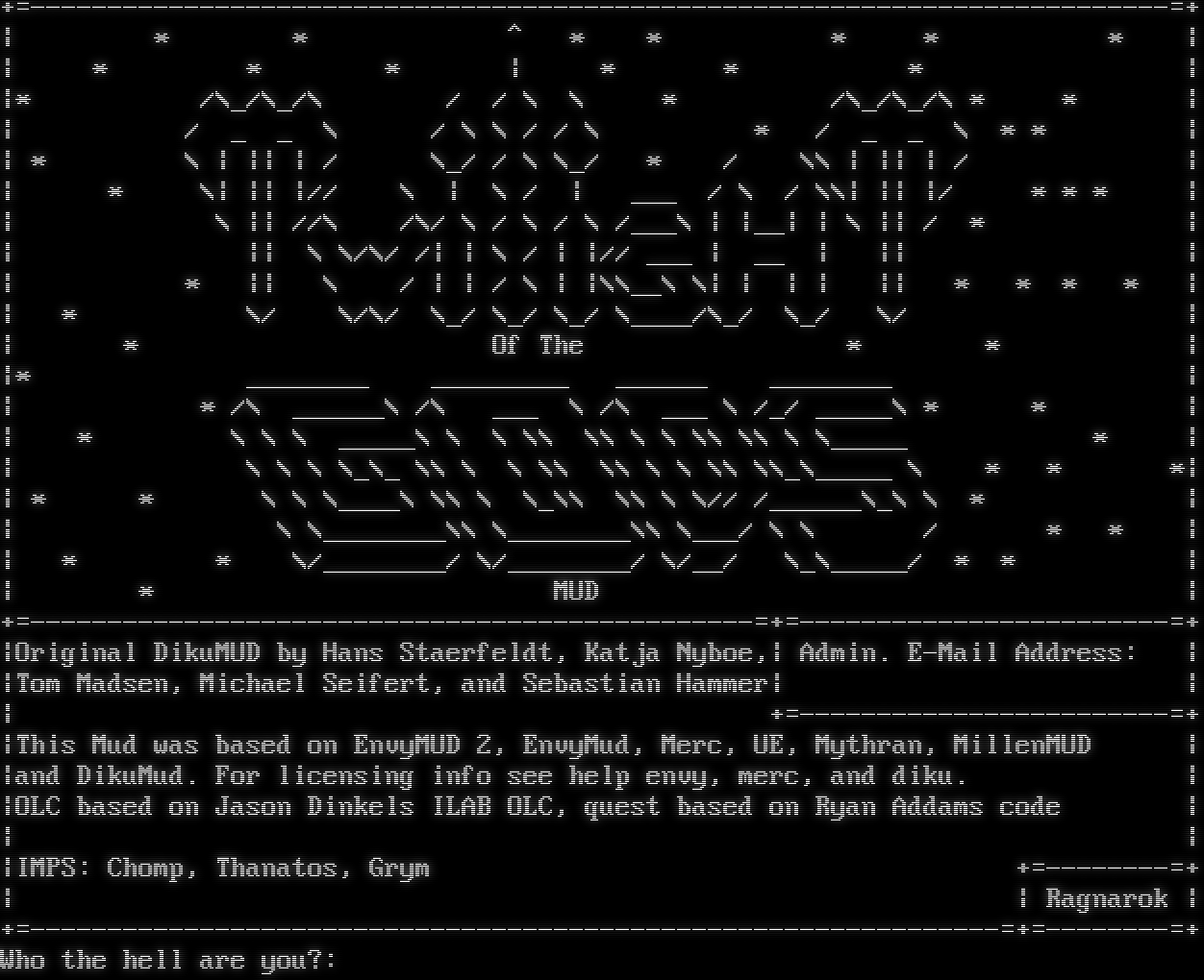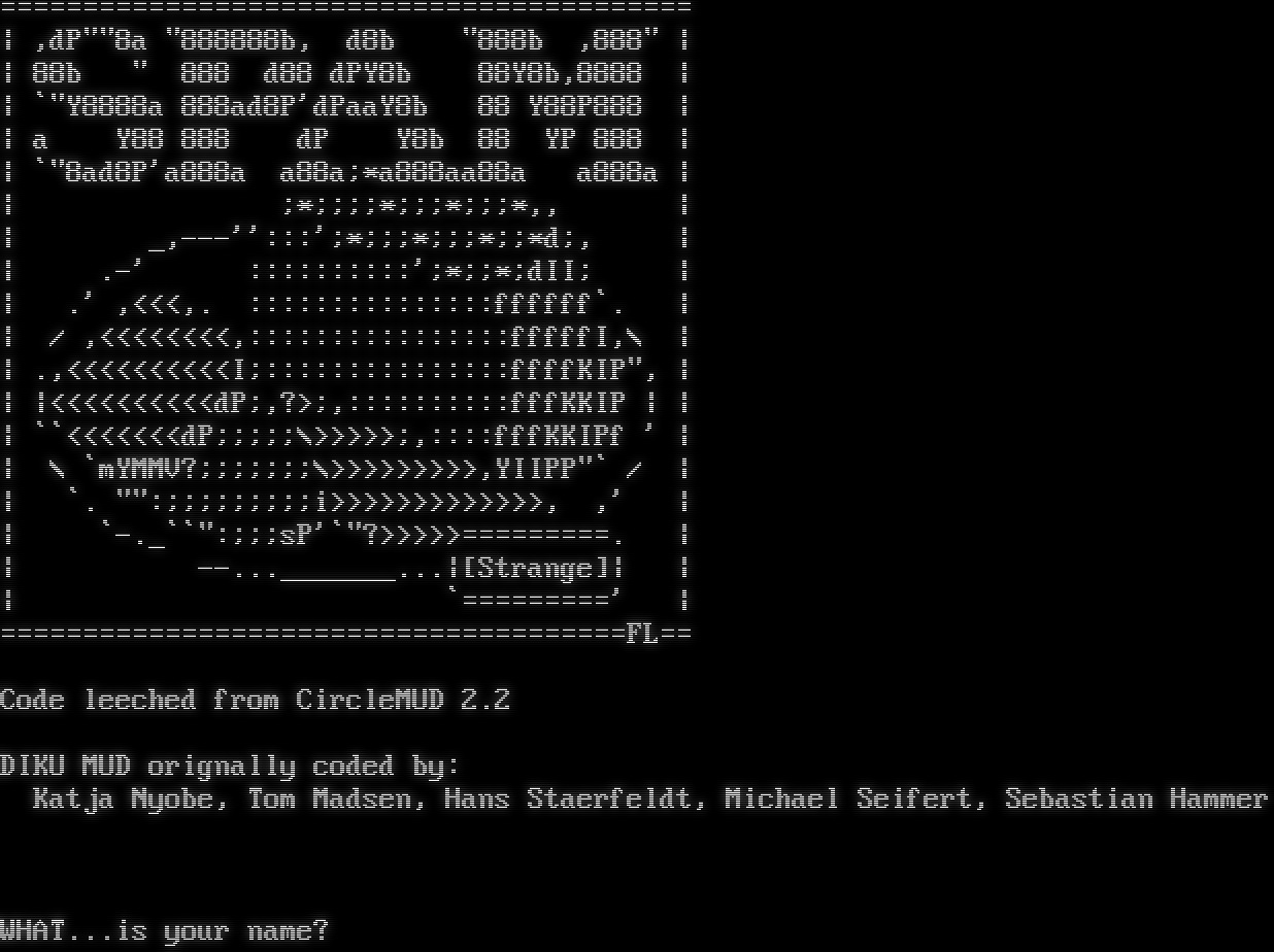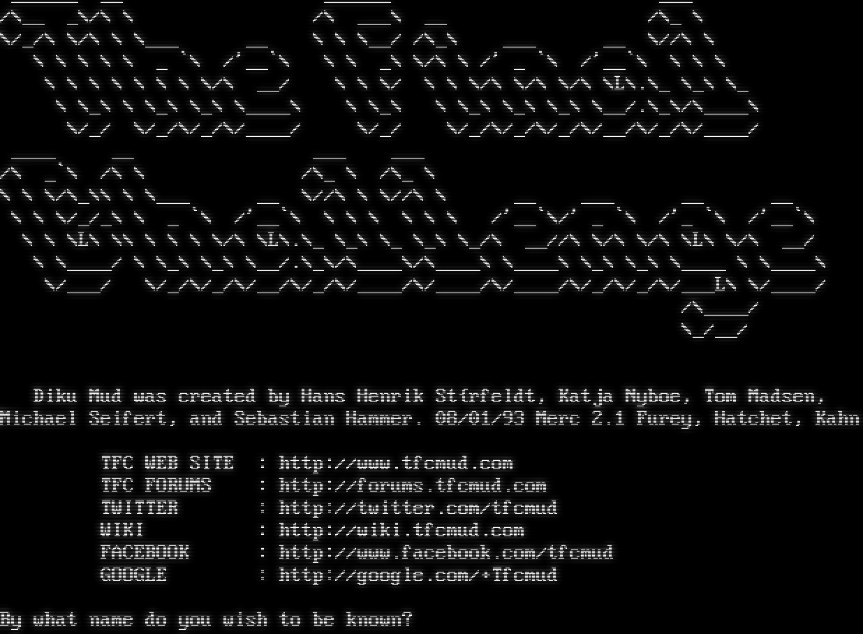 Attempting to Detect Client, Please Wait... [Client] xterm-256color \| [Colors] 256 \| [NAWS] 80x25 \| [MXP] Yes \| [GMCP] Yes # ## # ## ### # ## ## ### ## # # # # # # # # # # # # # # # # # # # # # # # ## # ## # # # # ### # # # # # ### # ## #โ€‹### # # # # # ## ## # # ### ### ## # # # # # # ## Based upon: CircleMUD 3.0 (with parts from tbaMUD) By Jeremy Elson Original DikuMUD by Hans Staerfeldt, Katja Nyboe, Tom Madsen, Michael Seifert and Sebastian Hammer. Whom do you wish to be known as?