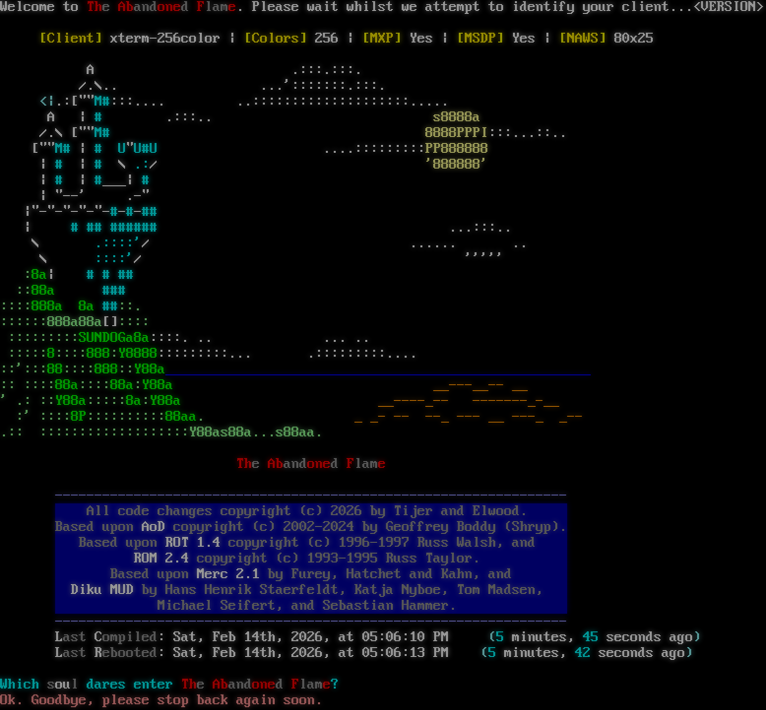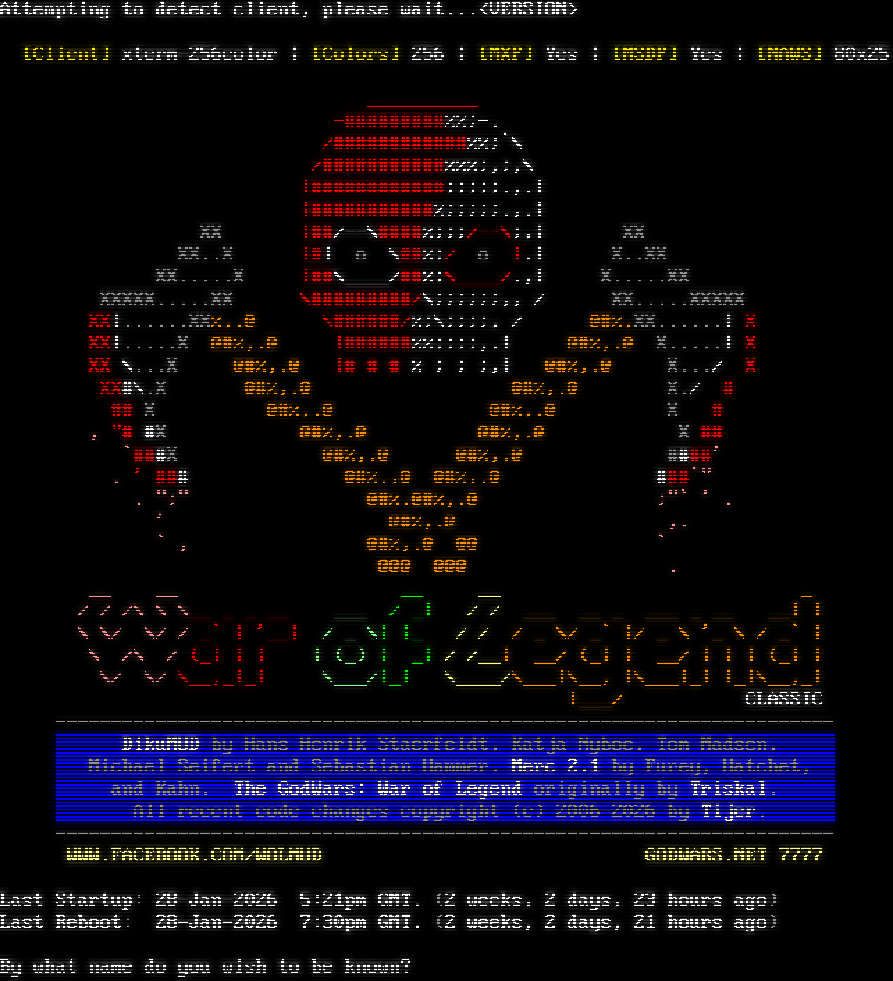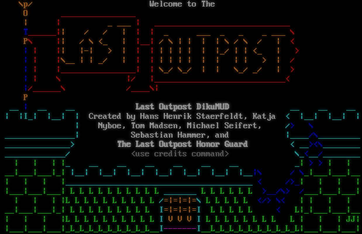 Attempting to Detect Client, Please Wait... [Client] xterm-256color \| [Colors] 256 \| [NAWS] 80x25 \| [MXP] Yes \| [GMCP] Yes # ## # ## ### # ## ## ### ## # # # # # # # # # # # # # # # # # # # # # # # ## # ## # # # # ### # # # # # ### # ## #โ€‹### # # # # # ## ## # # ### ### ## # # # # # # ## Based upon: CircleMUD 3.0 (with parts from tbaMUD) By Jeremy Elson Original DikuMUD by Hans Staerfeldt, Katja Nyboe, Tom Madsen, Michael Seifert and Sebastian Hammer. Whom do you wish to be known as?