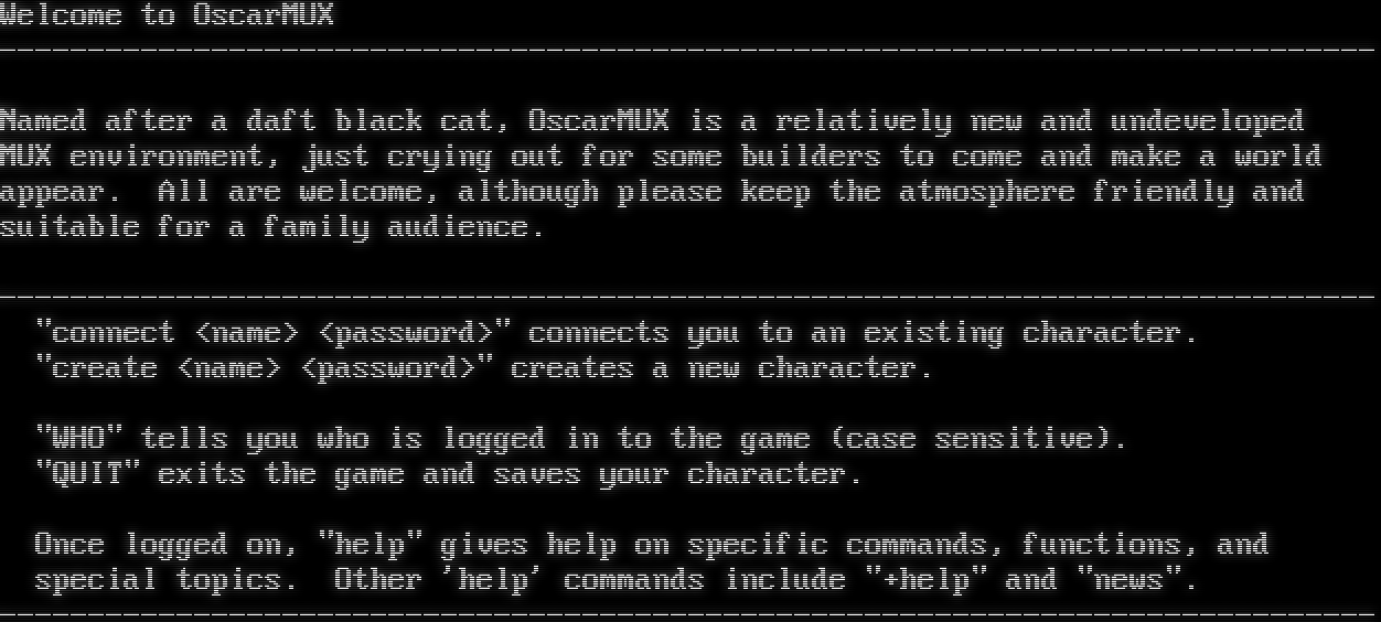 Welcome to OscarMUX -โ€‹----------------------------------------------------------------------------- Named after a daft black cat, OscarMUX is a relatively new and undeveloped MUX environment, just crying out for some builders to come and make a world appear. All are welcome, although please keep the atmosphere friendly and suitable for a family audience. -โ€‹----------------------------------------------------------------------------- "connect <name> <password>" connects you to an existing character. "create <name> <password>" creates a new character. "WHO" tells you who is logged in to the game (case sensitive). "QUIT" exits the game and saves your character. Once logged on, "help" gives help on specific commands, functions, and special topics. Other 'help' commands include "+help" and "news". -โ€‹-----------------------------------------------------------------------------