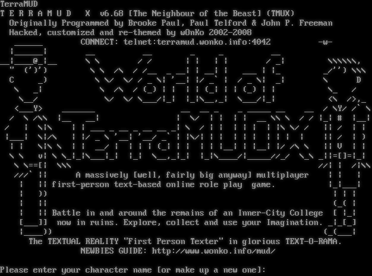 TerraMUD T E R R A M U D X v6.68 [The Neighbour of the Beast] (TMUX) Originally Programmed by Brooke Paul, Paul Telford & John P. Freeman Hacked, customized and re-themed by wOnKo 2002-2008 _โ€‹_____ CONNECT: telnet:terramud.wonko.info:4042 -w- \|_โ€‹_____\| __ __ _ _ __ __\|_โ€‹___@_\|__ \\ \\ / / \| \| \| \| / _\| \\\\\\\\\\\\, " (')') \\ \\ /\\ / /__ _ __\| \| __\| \| ___ \| \|_ _/'') \\\\\\ C _) \\ \\/ \\/ / _ \\\| '__\| \|/ _\` \| / _ \\\| _\| \\ D \\ _\| \\ /\\ / (_) \| \| \| \| (_\| \| \| (_) \| \| \\_ / \\__/ \\/ \\/ \\___/\|_\| \|_\|\\__,_\| \\___/\|_\| <\\ />,_ <___Y> _โ€‹______ __ __ _ _ _โ€‹____ __ __ / \\Y/ /\` \\ / \\ /\\\\ \|__ __\| \| \\/ \| \| \| \| __ \\\\ \\ / / \|_\| # \|__\| / \| \\\|\\ \| \| ___ _ __ _ __ __ _\| \\ / \| \| \| \| \| \| \|\\ \\/ / \|\| / \| \| \|___\| \\\|/\\ \| \|/ _ \\ '__\| '__/ _\` \| \|\\/\| \| \| \| \| \| \| \| \| \| \|\| / \| ) \| \| \\\|\\ \\ \| \| __/ \| \| \| \| (_\| \| \| \| \| \|__\| \| \|__\| \|/ /\\ \\ \|\| V \| \| \\ \\ v\| \\ \\_\|_\|\\___\|_\| \|_\| \\__,_\|_\| \|_\|\\_โ€‹___/\|_โ€‹____//_/ \\_\\ _\|\|=[]=\|_\| \\ \\==[\| \\\\\\ //\| \| /\|\\\\ ///\` \|\| A massively [well, fairly big anyway] multiplayer \| \| \| \| \|\| first-person text-based online role play game. \|_\|___\| \| )) \| \| \| \| \|\| (_( \| \| \|\| Battle in and around the remains of an Inner-City College [ \|_\| [___]] now in ruins. Explore, collect and use your Imagination. _\|_[_] \|_โ€‹___)) (_(___\| The TEXTUAL REALITY "First Person Texter" in glorious TEXT-O-RAMA. NEWBIES GUIDE: http://www.wonko.info/mud/ Please enter your character name [or make up a new one]: