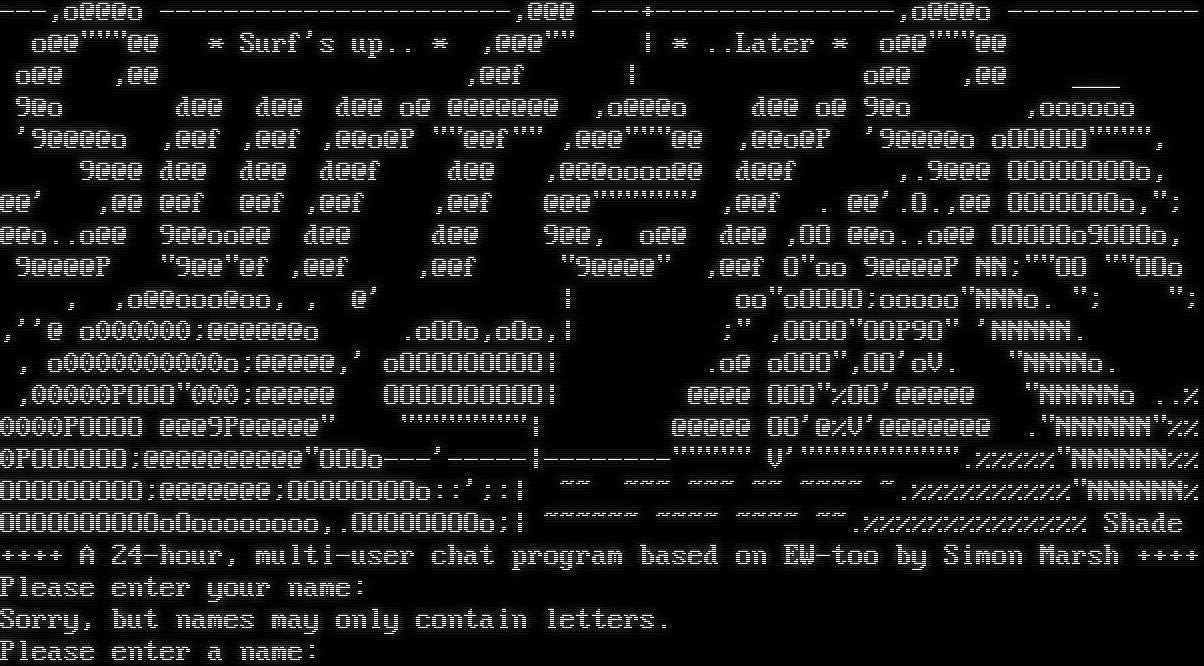 ---,o@@@o -โ€‹---------------------,@@@ -โ€‹--+---------------,o@@@o -โ€‹----------- o@@"""@@ \* Surf's up.. \* ,@@@"" \| \* ..Later \* o@@"""@@ o@@ ,@@ ,@@f \| o@@ ,@@ ___ 9@o d@@ d@@ d@@ o@ @@@@@@@ ,o@@@o d@@ o@ 9@o ,oooooo '9@@@@o ,@@f ,@@f ,@@o@P ""@@f"" ,@@@"""@@ ,@@o@P '9@@@@o oOOOOO"โ€‹""", 9@@@ d@@ d@@ d@@f d@@ ,@@@oooo@@ d@@f ,.9@@@ OOOOOOOOo, @@' ,@@ @@f @@f ,@@f ,@@f @@@"โ€‹"""""' ,@@f . @@'.O.,@@ OOOOOOOo,"; @@o..o@@ 9@@oo@@ d@@ d@@ 9@@, o@@ d@@ ,OO @@o..o@@ OOOOOo9OOOo, 9@@@@P "9@@"@f ,@@f ,@@f "9@@@@" ,@@f O"oo 9@@@@P NN;""OO ""OOo , ,o@@ooo@oo, , @' \| oo"oOOOO;ooooo"NNNo. "; "; ,''@ o000000;@@@@@@o .oOOo,oOo,\| ;" ,OOOO"OOP9O" 'NNNNN. , o0000000000o;@@@@@,' oOOOOOOOOO\| .o@ oOOO",OO'oV. "NNNNo. ,00000POOO"000;@@@@@ OOOOOOOOOO\| @@@@ OOO"%OO'@@@@@ "NNNNNo ..% 0000POOOO @@@9P@@@@@" "โ€‹"""""""\| @@@@@ OO'@%V'@@@@@@@ ."NNNNNN"%% 0POOOOOO;@@@@@@@@@@"OOOo---'-โ€‹----\|-โ€‹-------""""" V'"โ€‹""""""""".%%%%%"NNNNNN%% OOOOOOOOO;@@@@@@@;OOOOOOOOo::';:\| ~~ ~~~ ~~~ ~~ ~โ€‹~~~ ~.%%%%%%%%%%"NNNNNN% OOOOOOOOOOoOoooooooo,.OOOOOOOOo;\| ~โ€‹~~~~~ ~โ€‹~~~ ~โ€‹~~~ ~~.%%%%%%%%%%%%%% Shade +โ€‹+++ A 24-hour, multi-user chat program based on EW-too by Simon Marsh +โ€‹+++ Please enter your name: Sorry, but names may only contain letters. Please enter a name: