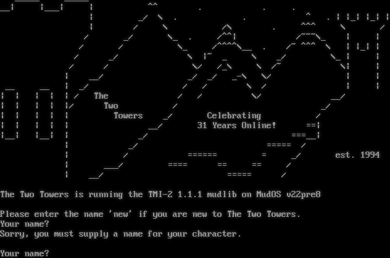 _โ€‹____ _โ€‹____ __\| \|___\| \| ^^ . . . \| _/ \\ . . ^ . \| \|_\| \|_\| \| \| / \\ /\\ . ^^^ \\ / / _/ \\_ . /^^\| /~~~\\_ \| \| / / \\_ /^โ€‹^^^\\__ . /~ ^^^ \\ \| \|_\| \| / _/ \\ \|~ _ \\ _/ \\_ \| \| / / \\/ /_\\ \\ /~ \\\| \| \| __/ _/ _/ _-\\ \\/ \| \| __ __ \| _/ / / \\ / \| \| \| \| \| \| \| / The / / \\/ __/ \| \| \| \| \|/ Two / _/ \| \| \| \| \| Towers _/ Celebrating / \| \| \| \| \| __/ 31 Years Online! ==\| \|__\| \|__\| \| _/ =โ€‹==__\| \| _/ =โ€‹==== / \| / =โ€‹===== = _/ est. 1994 \| ___/ =โ€‹=== == == / \| __/ =โ€‹==== / The Two Towers is running the TMI-2 1.1.1 mudlib on MudOS v22pre8 Please enter the name 'new' if you are new to The Two Towers. Your name? Sorry, you must supply a name for your character. Your name?