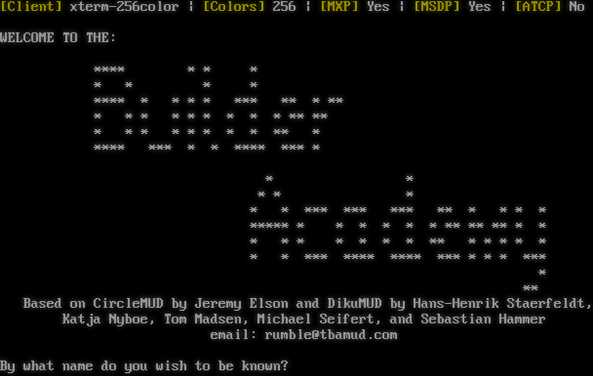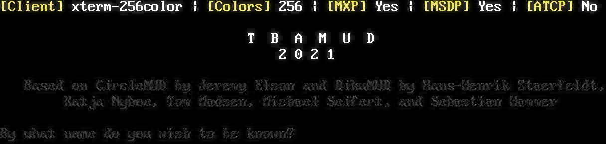 Attempting to Detect Client, Please Wait... [Client] xterm-256color \| [Colors] 256 \| [MXP] Yes \| [MSDP] Yes \| [ATCP] No T B A M U D 2 0 2 1 Based on CircleMUD by Jeremy Elson and DikuMUD by Hans-Henrik Staerfeldt, Katja Nyboe, Tom Madsen, Michael Seifert, and Sebastian Hammer By what name do you wish to be known?