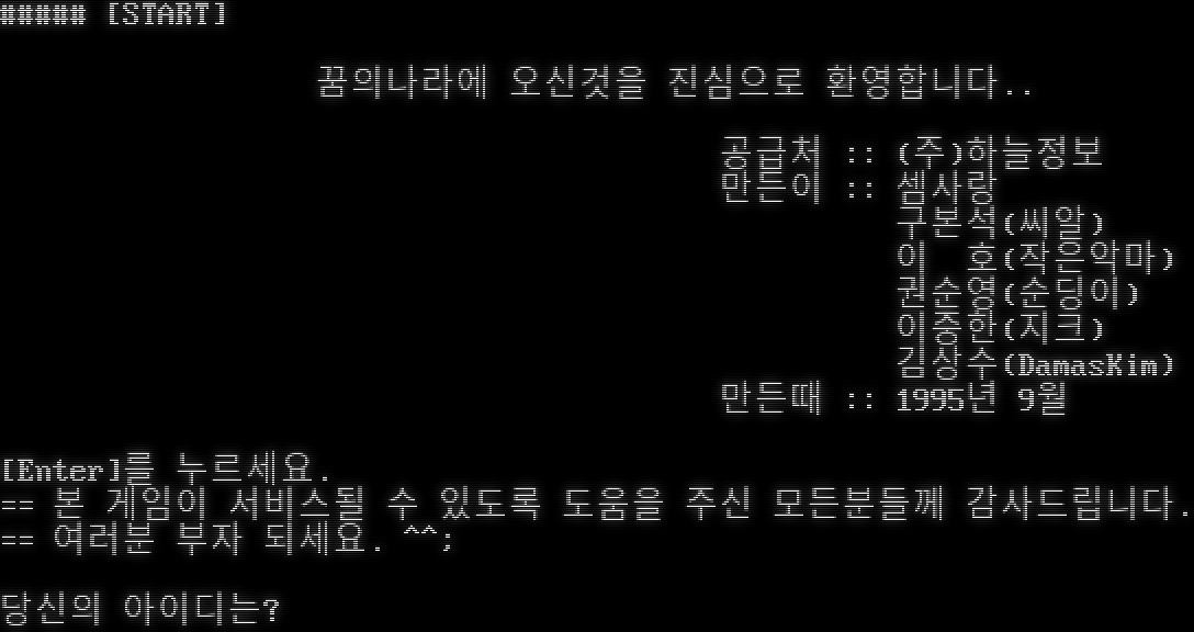 #โ€‹#### [START] ๊ฟˆ์˜๋‚˜๋ผ์— ์˜ค์‹ ๊ฒƒ์„ ์ง„์‹ฌ์œผ๋กœ ํ™˜์˜ํ•ฉ๋‹ˆ๋‹ค.. ๊ณต๊ธ‰์ฒ˜ :: (์ฃผ)ํ•˜๋Š˜์ •๋ณด ๋งŒ๋“ ์ด :: ์…ˆ์‚ฌ๋ž‘ ๊ตฌ๋ณธ์„(์”จ์•Œ) ์ด ํ˜ธ(์ž‘์€์•…๋งˆ) ๊ถŒ์ˆœ์˜(์ˆœ๋”ฉ์ด) ์ด์ค‘ํ•œ(์ง€ํฌ) ๊น€์ƒ์ˆ˜(DamasKim) ๋งŒ๋“ ๋•Œ :: 1995๋…„ 9์›” [Enter]๋ฅผ ๋ˆ„๋ฅด์„ธ์š”. == ๋ณธ ๊ฒŒ์ž„์ด ์„œ๋น„์Šค๋  ์ˆ˜ ์žˆ๋„๋ก ๋„์›€์„ ์ฃผ์‹  ๋ชจ๋“ ๋ถ„๋“ค๊ป˜ ๊ฐ์‚ฌ๋“œ๋ฆฝ๋‹ˆ๋‹ค. == ์—ฌ๋Ÿฌ๋ถ„ ๋ถ€์ž ๋˜์„ธ์š”. ^^; ๋‹น์‹ ์˜ ์•„์ด๋””๋Š”?