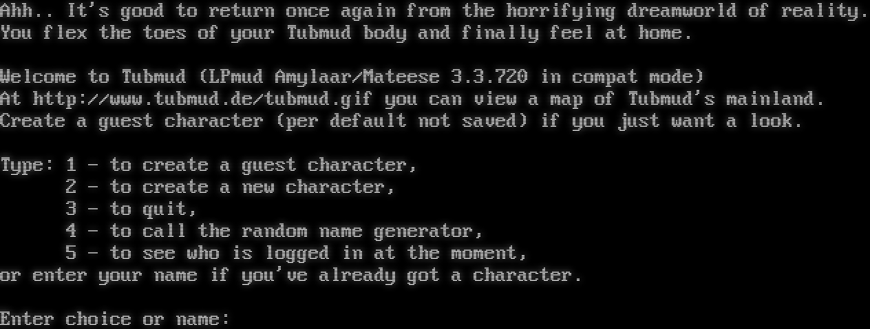 <!DOCTYPE HTML PUBLIC "-//W3C//DTD HTML 4.0 Transitional//EN"><!-- Ahh.. It's good to return once again from the horrifying dreamworld of reality. You flex the toes of your Tubmud body and finally feel at home. Welcome to Tubmud (LPmud Amylaar/Mateese 3.3.720 in compat mode) At http://www.tubmud.de/tubmud.gif you can view a map of Tubmud's mainland. Create a guest character (per default not saved) if you just want a look. Type: 1 - to create a guest character, 2 - to create a new character, 3 - to quit, 4 - to call the random name generator, 5 - to see who is logged in at the moment, or enter your name if you've already got a character. Enter choice or name:
