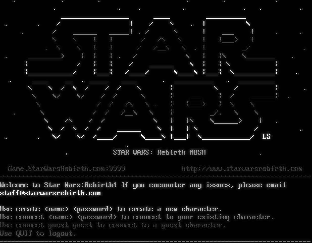 . . . . . . . . . . . . . _โ€‹________________ _โ€‹___ _โ€‹_________ . . / \| / \\ . \| \\ . / _โ€‹_____ _โ€‹____\| . / \\ \| ___ \| . . \\ \\ \| \| / /\\ \\ \| \|___> \| . \\ \\ \| \| / /__\\ \\ . \| _/ . . _โ€‹_______> \| \| \| . / \\ \| \|\\ \\_โ€‹______ . \| / \| \| / _โ€‹_____ \\ \| \| \\ \| \|_โ€‹__________/ \|___\| /_โ€‹___/ \\_โ€‹___\\ \|___\| \\_โ€‹_________\| . . _โ€‹___ __ . _โ€‹____ _โ€‹___ . _โ€‹_________ . _โ€‹________ \\ \\ / \\ / / / \\ \| \\ / \| . \\ \\/ \\/ / / \\ \| ___ \| / _โ€‹_____\| . \\ / / /\\ \\ . \| \|___> \| \\ \\ . \\ / / /__\\ \\ \| _/. \\ \\ \\ /\\ / / \\ \| \|\\ \\_โ€‹_____> \| . \\ / \\ / / _โ€‹_____ \\ \| \| \\ / . . . \\/ \\/ /_โ€‹___/ \\_โ€‹___\\ \|___\| \\_โ€‹___________/ LS . , STAR WARS: Rebirth MUSH . Game.StarWarsRebirth.com:9999 http://www.starwarsrebirth.com -โ€‹---------------------------------------------------------------------------- Welcome to Star Wars:Rebirth! If you encounter any issues, please email staff@starwarsrebirth.com Use create <name> <password> to create a new character. Use connect <name> <password> to connect to your existing character. Use connect guest guest to connect to a guest character. Use QUIT to logout. -โ€‹----------------------------------------------------------------------------