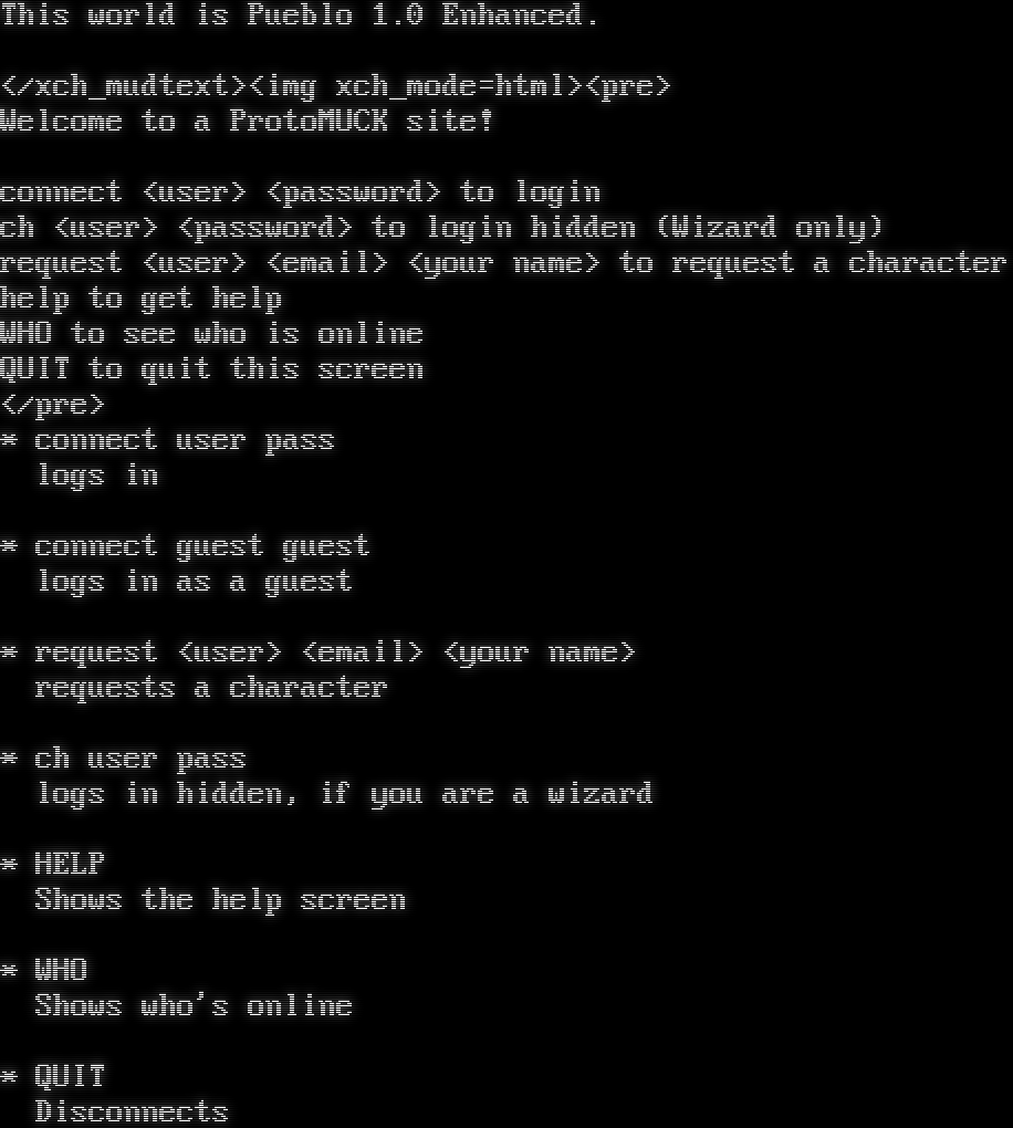 This world is Pueblo 1.0 Enhanced. </xch_mudtext><img xch_mode=html><pre> Welcome to a ProtoMUCK site! connect <user> <password> to login ch <user> <password> to login hidden (Wizard only) request <user> <email> <your name> to request a character help to get help WHO to see who is online QUIT to quit this screen </pre> \* connect user pass logs in \* connect guest guest logs in as a guest \* request <user> <email> <your name> requests a character \* ch user pass logs in hidden, if you are a wizard \* HELP Shows the help screen \* WHO Shows who's online \* QUIT Disconnects