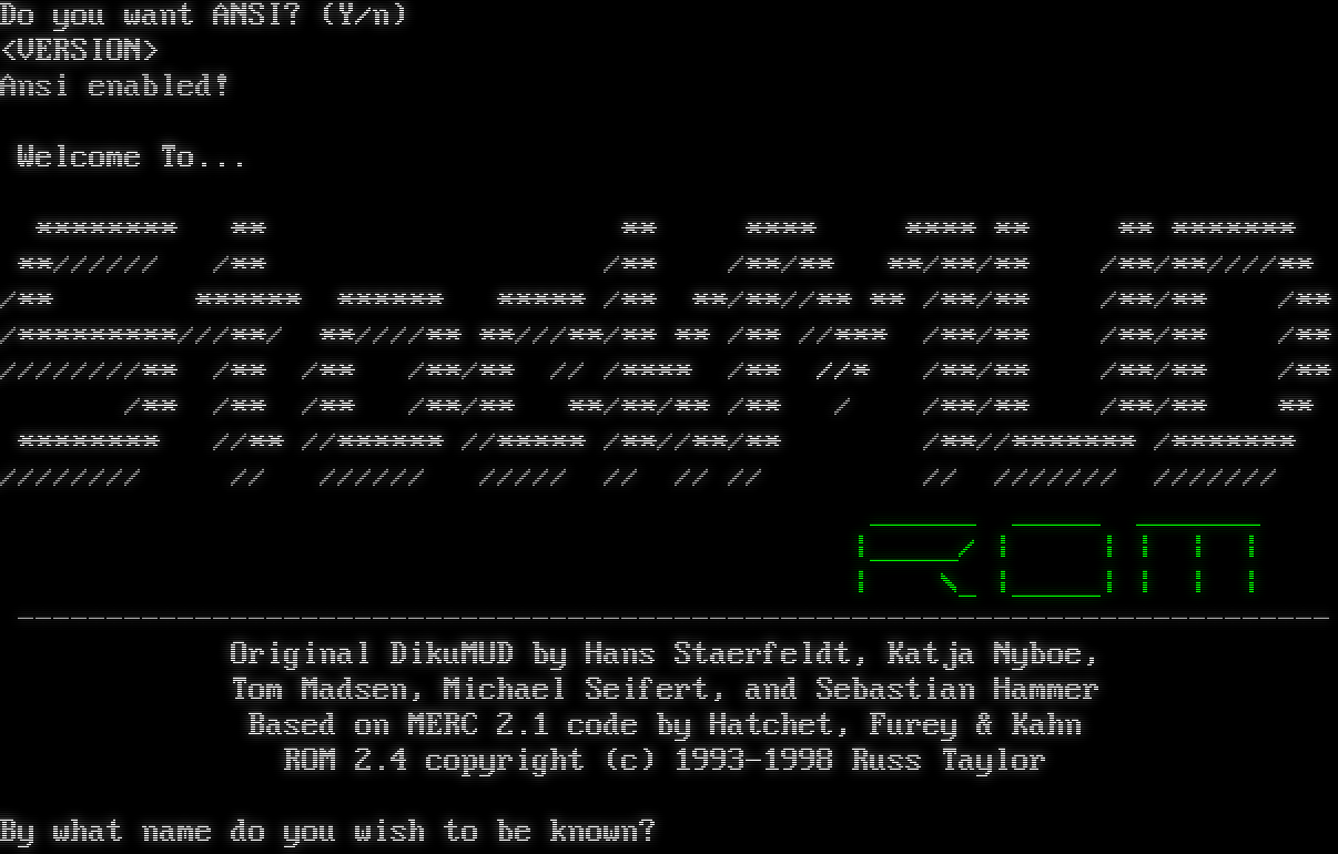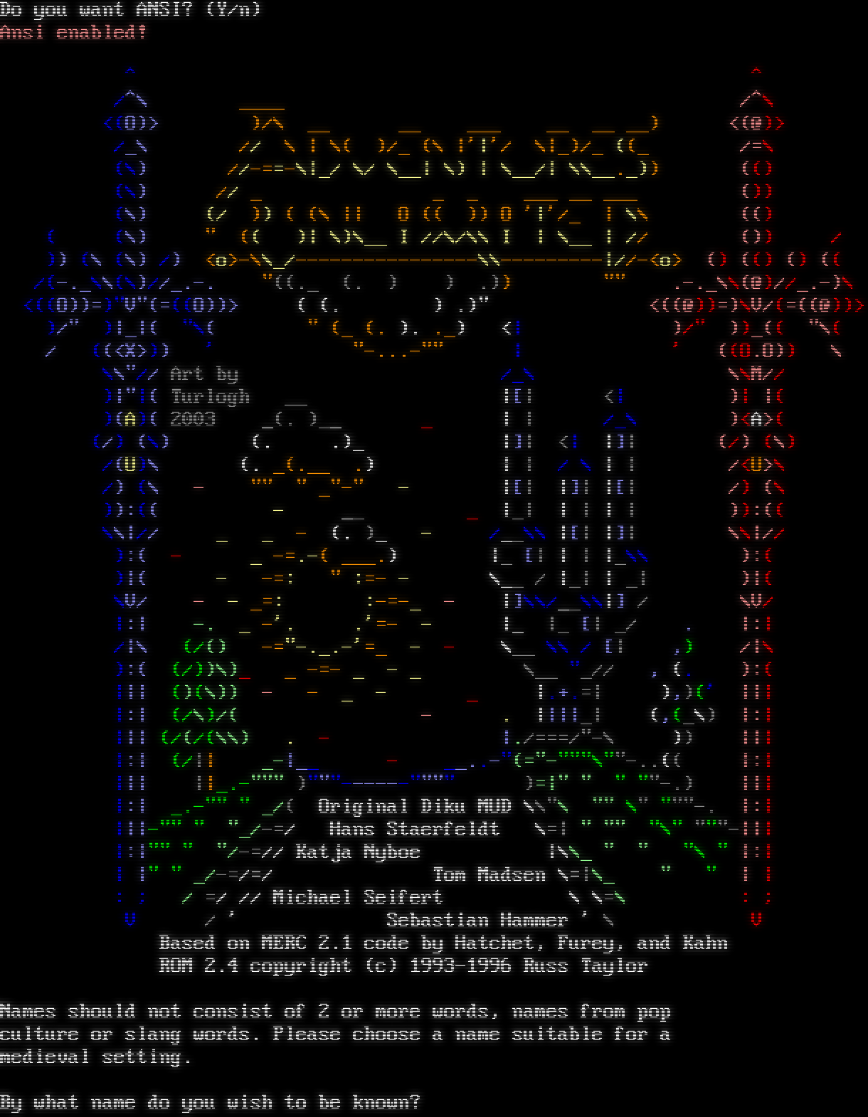 Do you want ANSI? (Y/n) Ansi enabled! ^ ^ /^\\ _โ€‹___ /^\\ <(O)> )/\\ __ __ ___ __ __ __) <(@)> /_\\ // \\ \| \\( )/_ (\\ \|'\|'/ \\\|_)/_ ((_ /=\\ (\\) //-โ€‹==-\\\|_/ \\/ \\__\| \\) \| \\__/\| \\\\_โ€‹_._)) (() (\\) // _ _ _ ___ __ ___ ()) (\\) (/ )) ( (\\ \|\| O (( )) O '\|'/_ \| \\\\ (() ( (\\) " (( )\| \\)\\__ I //\\/\\\\ I \| \\__ \| // ()) / )) (\\ (\\) /) <o>-\\\\_/-โ€‹---------------\\\\-โ€‹--------\|//-<o> () (() () (( /(-._\\\\(\\)//_โ€‹.-. "((._ (. ) ) .)) "" .โ€‹-._\\\\(@)//_.-)\\ <((O))=)"V"(=((O))> ( (. ) .)" <((@))=)\\V/(=((@))> )/" )\|_\|( "\\( " (_ (. ). ._) <\| )/" ))_(( "\\( / ((<X>)) ' "โ€‹-...-"" \| ' ((O.O)) \\ \\\\"// Art by /_\\ \\\\M// )\|"\|( Turlogh __ \|[\| <\| )\| \|( )(A)( 2003 _(. )__ _ \| \| /_\\ )<A>( (/) (\\) (. .)_ \|]\| <\| \|]\| (/) (\\) /(U)\\ (. _(.__ .) \| \| / \\ \| \| /<U>\\ /) (\\ - "" " _โ€‹"-" - \|[\| \|]\| \|[\| /) (\\ )):(( - __ _ \|_\| \| \| \| \| )):(( \\\\\|// _ _ - (. )_ - /__\\\\ \|[\| \|]\| \\\\\|// ):( - _ -โ€‹=.-( _โ€‹__.) \|_ [\| \| \| \|_\\\\ ):( )\|( - -=: " :=- - \\__ / \|_\| \| _\| )\|( \\V/ - - _=: :-โ€‹=-_ - \|]\\\\/__\\\\\|] / \\V/ \|:\| -. _ -'. .'=- - \|_ \|_ [\| _/ . \|:\| /\|\\ (/() -โ€‹="-._.-'=_ - - \\__ \\\\ / [\| ,) /\|\\ ):( (/))\\)_ _ -=- _ - _ \\__ "_// , (. ):( \|\|\| ()(\\)) - - _ - _ \|.โ€‹+.=\| ),)(' \|\|\| \|:\| (/\\)/( - . \|\|\|\|_\| (,(_\\) \|:\| \|\|\| (/(/(\\\\) . - \|./===/"-\\ )) \|\|\| \|:\| (/\|\| _-\|__ - _โ€‹_..-"(=โ€‹"-"""\\"โ€‹"-..(( \|:\| \|\|\| \|\|_โ€‹.-""" )"โ€‹""------"""" )=\|" " " "โ€‹"-.) \|\|\| \|:\| _โ€‹.-"" " _/( Original Diku MUD \\\\"\\ "" \\" "โ€‹""-. \|:\| \|\|\|-"" " "_/-=/ Hans Staerfeldt \\=\| " "" "\\" "โ€‹""-\|\|\| \|:\|"" " "/-=// Katja Nyboe \|\\\\_ " " "\\ " \|:\| \| \|" " _/-=/=/ Tom Madsen \\=\|\\_ " " \| \| : ; / =/ // Michael Seifert \\ \\=\\ : ; V / ' Sebastian Hammer ' \\ V Based on MERC 2.1 code by Hatchet, Furey, and Kahn ROM 2.4 copyright (c) 1993-1996 Russ Taylor Names should not consist of 2 or more words, names from pop culture or slang words. Please choose a name suitable for a medieval setting. By what name do you wish to be known?