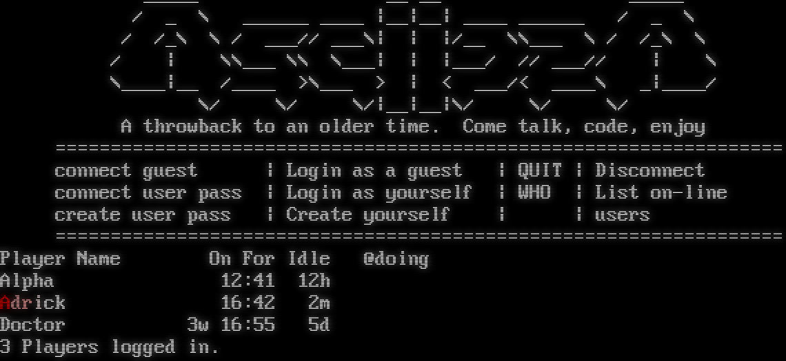_โ€‹____ __ __ _โ€‹____ / _ \\ _โ€‹_____ _โ€‹___ \|__\|__\| _โ€‹___ _โ€‹_____ / _ \\ / /_\\ \\ / ___// ___\\\| \| \|/__ \\\\___ \\ / /_\\ \\ / \| \\\\___ \\\\ \\___\| \| \|___/ // ___// \| \\ \\_โ€‹___\|__ /_โ€‹___ >\\___ > \| < ___/< _โ€‹___\\ _\|_โ€‹___/ \\/ \\/ \\/\|__\|__\|\\/ \\/ \\/ A throwback to an older time. Come talk, code, enjoy =โ€‹================================================================= connect guest \| Login as a guest \| QUIT \| Disconnect connect user pass \| Login as yourself \| WHO \| List on-line create user pass \| Create yourself \| \| users =โ€‹================================================================= Player Name On For Idle @doing Alpha 12:41 12h Adrick 16:42 2m Doctor 3w 16:55 5d 3 Players logged in.