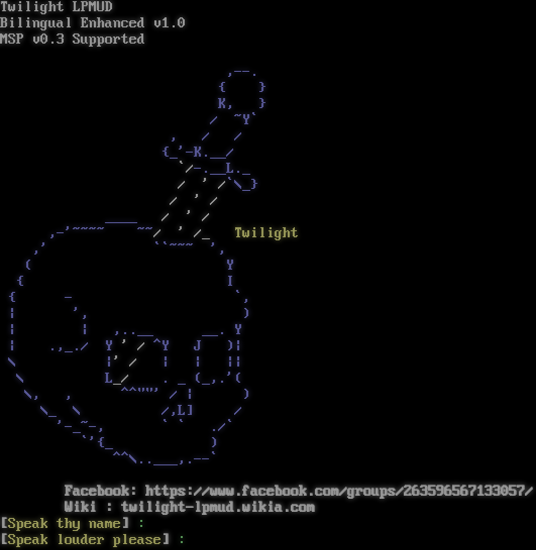 Twilight LPMUD Bilingual Enhanced v1.0 MSP v0.3 Supported ,--. { } K, } / ~Y\` , / / {_'-K.__/ \`/-โ€‹.__L._ / ' /\`\\_} / ' / _โ€‹___ / ' / ,-'~โ€‹~~~ ~~/ ' /_ Twilight ,' \`\`~~~ ', ( Y { I { - \`, \| ', ) \| \| ,.โ€‹.__ __. Y \| .,_./ Y ' / ^Y J )\| \\ \|' / \| \| \|\| \\ L_/ . _ (_,.'( \\, , ^โ€‹^""' / \| ) \\_ \\ /,L] / '-โ€‹_~-, \` \` ./\` \`'{_ ) ^^\\.โ€‹.___,.--\` Facebook: https://www.facebook.com/groups/263596567133057/ Wiki : twilight-lpmud.wikia.com [Speak thy name] : [Speak louder please] :