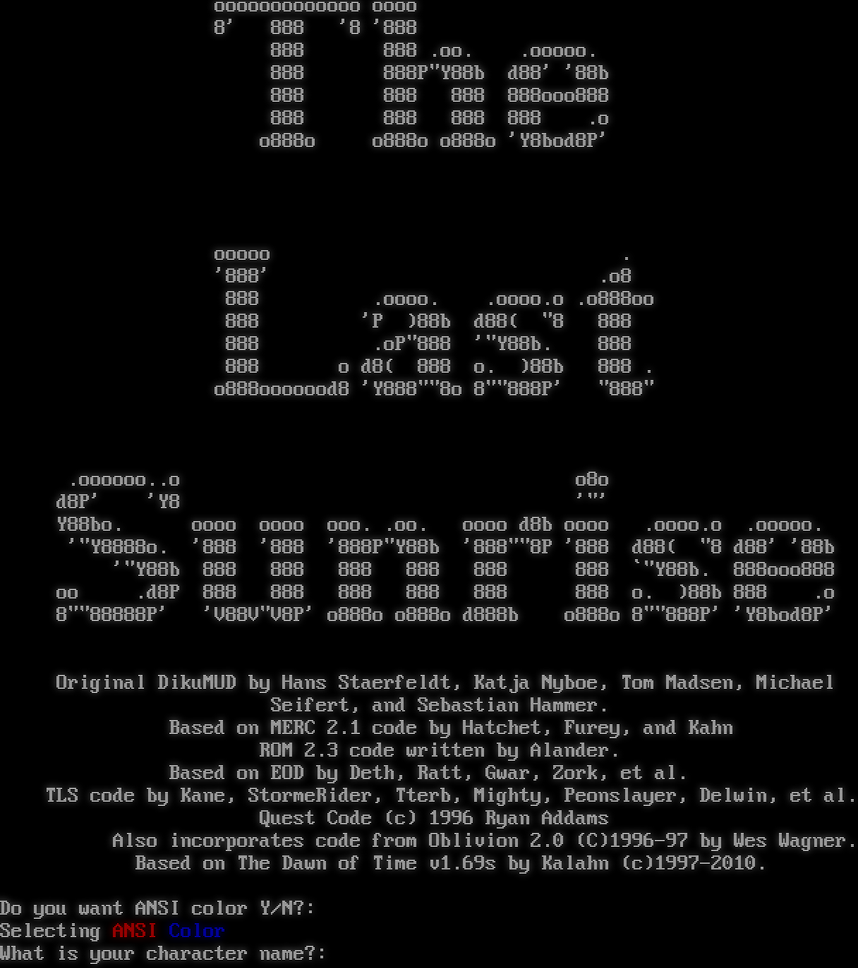 ooooooooooooo oooo 8' 888 '8 '888 888 888 .oo. .ooooo. 888 888P"Y88b d88' '88b 888 888 888 888ooo888 888 888 888 888 .o o888o o888o o888o 'Y8bod8P' ooooo . '888' .o8 888 .oooo. .oooo.o .o888oo 888 'P )88b d88( "8 888 888 .oP"888 '"Y88b. 888 888 o d8( 888 o. )88b 888 . o888ooooood8 'Y888""8o 8""888P' "888" .oooooo..o o8o d8P' 'Y8 '"' Y88bo. oooo oooo ooo. .oo. oooo d8b oooo .oooo.o .ooooo. '"Y8888o. '888 '888 '888P"Y88b '888""8P '888 d88( "8 d88' '88b '"Y88b 888 888 888 888 888 888 \`"Y88b. 888ooo888 oo .d8P 888 888 888 888 888 888 o. )88b 888 .o 8""88888P' 'V88V"V8P' o888o o888o d888b o888o 8""888P' 'Y8bod8P' Original DikuMUD by Hans Staerfeldt, Katja Nyboe, Tom Madsen, Michael Seifert, and Sebastian Hammer. Based on MERC 2.1 code by Hatchet, Furey, and Kahn ROM 2.3 code written by Alander. Based on EOD by Deth, Ratt, Gwar, Zork, et al. TLS code by Kane, StormeRider, Tterb, Mighty, Peonslayer, Delwin, et al. Quest Code (c) 1996 Ryan Addams Also incorporates code from Oblivion 2.0 (C)1996-97 by Wes Wagner. Based on The Dawn of Time v1.69s by Kalahn (c)1997-2010. Do you want ANSI color Y/N?: Selecting ANSI Color What is your character name?: