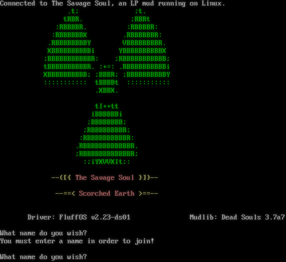Connected to The Savage Soul, an LP mud running on Linux. .t; ;t. tRBR. ;RBRt :RBBBBR. :RBBBBR: :RBBBBBBX .RBBBBBBR: .RBBBBBBBBY VBBBBBBBBR. XBBBBBBBBBBi YBBBBBBBBBBX ;BBBBBBBBBBBR: ;RBBBBBBBBBBB; tBBBBBBBBBBR. :+=: .RBBBBBBBBBBi XBBBBBBBBBB; ;BBBR; ;BBBBBBBBBBY ::::::::::: tBBBBt ::::::::::: .XBBX. tI++tt iBBBBBBi ;BBBBBBBB; ;RBBBBBBBBR; :RBBBBBBBBBBR: .RBBBBBBBBBBBBR. ;RBBBBBBBBBBBBR; :;iYXVVXIt;: --([{ The Savage Soul }])-- -โ€‹-==< Scorched Earth >=โ€‹=-- Driver: FluffOS v2.23-ds01 Mudlib: Dead Souls 3.7a7 What name do you wish? You must enter a name in order to join! What name do you wish?