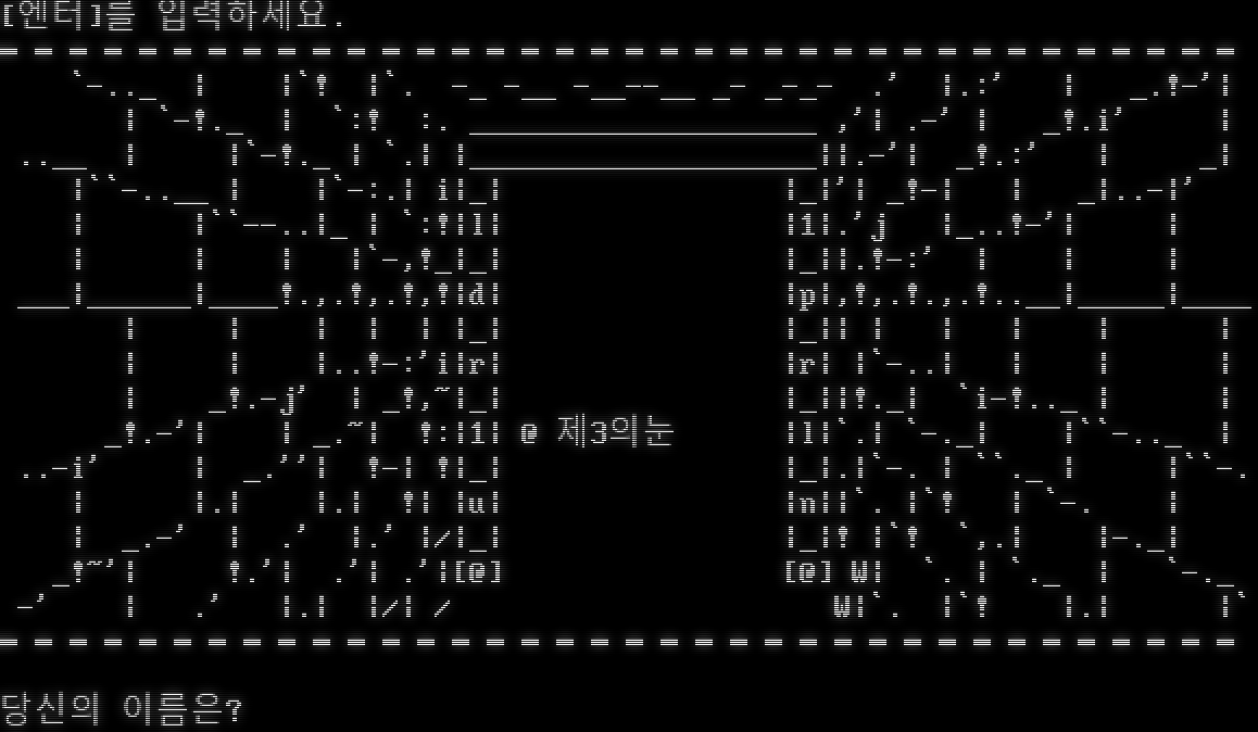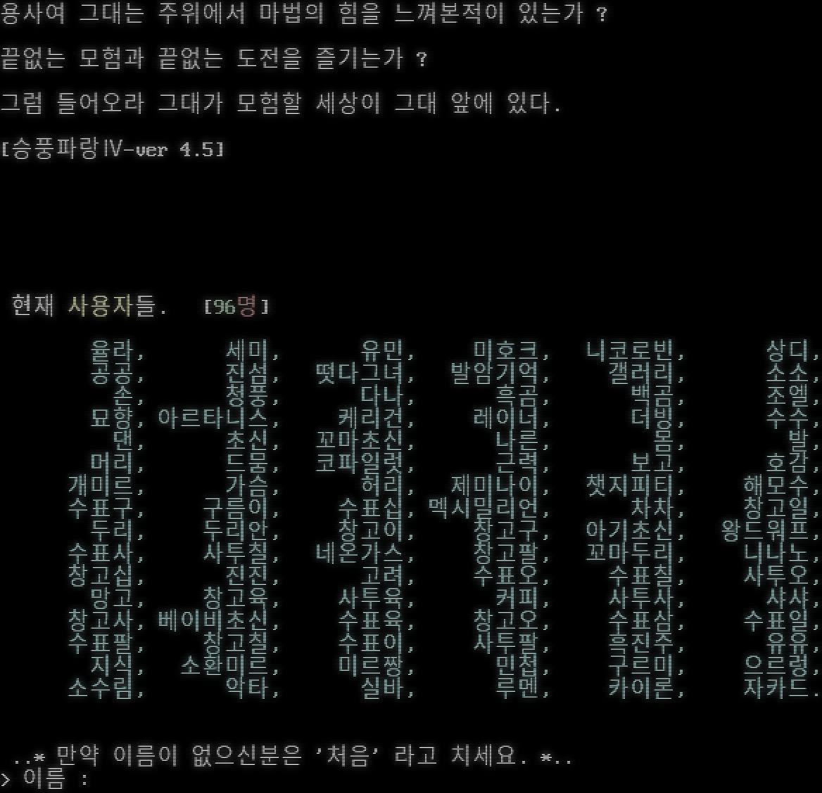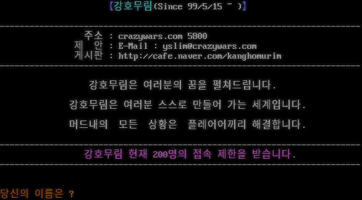 \|\|\|\|\|\|\|\|\|\|\|\|\|\|\|\|\|\|\|\|\|\|\|\|\|\|\|\|\|\|\|\|\|\|\|\|\|\|\|\|\|\|\|\|\|\|\|\|\|\|\|\|\|\|\|\|\|\|\|\|\|\|\|\|\|\|\|\|\|\|\|\|\|\|\|\|\|\| L E G E N D of H E A V E N \|\|\|\|\|\|\|\|\|\|\|\|\|\|\|\|\|\|\|\|\|\|\|\|\|\|\|\|\|\|\|\|\|\|\|\|\|\|\|\|\|\|\|\|\|\|\|\|\|\|\|\|\|\|\|\|\|\|\|\|\|\|\|\|\|\|\|\|\|\|\|\|\|\|\|\|\|\| , /\| __ [[ ์ฒœ์ƒ์˜ ์ „์„ค ]]โ„ข / \| ,-~ / Y :\| // / \| jj /( .^ ๋๋‚˜์ง€ ์•Š๋Š” ์˜์›ํ•œ ๋ชจํ—˜! >-โ€‹"~"-v" / Y ์‚ฌ๋ž‘,์šฐ์ •,๋ชจํ—˜,์šฉ๊ธฐ,์†Œ๋ง,๋ฏฟ์Œ,ํ–‰๋ณต jo o \| ( ~T~ j ๊ทธ ๋ชจ๋“ ๊ฒƒ์„ ์—ฌ๊ธฐ์„œ ๋А๋ผ์„ธ์š”.. >._-' _./ / "~" \| ์ค€๋น„๊ฐ€ ๋˜์…จ๋‹ค๋ฉด.. Y _, \| /\| ;-"~ _ l ์‚ด์ง.. [Enter]๋ฅผ ๋ˆŒ๋Ÿฌ์ฃผ์„ธ์š”!!.. / l/ ,-"~ ๏ผผ ๏ผผ//๏ผผ/ .- ๏ผผ Y / Y ๋ชจํ—˜์„ ์‹œ์ž‘ํ•ฉ๋‹ˆ๋‹ค.โ€‹... l I ! ]๏ผผ _๏ผผ /"๏ผผ (" ~โ€‹----( ~ Y. ) Let's Go! โ”โ”โ”โ”โ”โ”โ”โ”โ”โ”โ”โ”โ”โ”โ”โ”โ”โ”โ”โ”โ”โ”โ”โ”โ”โ”โ”โ”โ”โ”โ”โ”โ”โ”โ”โ”โ”โ”โ”  ์ ‘์†์ฃผ์†Œ : telnet toox.co.kr:6255 โ”โ”โ”โ”โ”โ”โ”โ”โ”โ”โ”โ”โ”โ”โ”โ”โ”โ”โ”โ”โ”โ”โ”โ”โ”โ”โ”โ”โ”โ”โ”โ”โ”โ”โ”โ”โ”โ”โ” ์ €ํฌ ์ฒœ์ƒ์˜ ์ „์„ค์„ ์ฐพ์•„์ฃผ์…”์„œ ๊ฐ์‚ฌํ•ฉ๋‹ˆ๋‹ค. \*^^\* [Enter] ๋ฅผ ๋ˆŒ๋Ÿฌ์ฃผ์„ธ์š”. โ”โ”โ”โ”โ”โ”โ”โ”โ”โ”โ”โ”โ”โ”โ”โ”โ”โ”โ”โ”โ”โ”โ”โ”โ”โ”โ”โ”โ”โ”โ”โ”โ”โ”โ”โ”โ”โ”โ” o o o o o o o . . . โ”โ”โ”โ”โ”โ”โ”โ”โ”โ”โ”โ”โ”โ”โ”โ”โ”โ”โ”โ”“ o _โ€‹____ โ”ƒ ์ „์„ค์€ ๊ณ„์†๋˜์–ด์•ผ ํ•œ๋‹ค. โ”ƒ .][__n_n_\|DD[ =โ€‹===_____ โ”ƒ โ”ƒ >(_โ€‹_______\|__\|_[_โ€‹________]_ โ”ƒ design by ์ˆ˜ํ˜ธ์ฒœ์‚ฌ โ”ƒ _/oo OOOOO oo\` ooo ooo โ”—โ”โ”โ”โ”โ”โ”โ”โ”โ”โ”โ”โ”โ”โ”โ”โ”โ”โ”โ”› -โ€‹-+-+-+-+-+-+-+-+-+-+-+-+-+-+-+-+-+-+-+-+-+-+-+-+-+-+-+-+-+-+-+-+-+-+-+-+-+-+- ๋ณธ ๋จธ๋“œ๋Š” toox.co.kr. ์„œ๋ฒ„์—์„œ ์šด์˜์ค‘์ž…๋‹ˆ๋‹ค. ์šด์˜์ž : ์ž๋‘, ๋™ํ™” โ”โ”โ”โ”โ”โ”โ”โ”โ”โ”โ”โ”โ”โ”โ”โ”โ”โ”โ”โ”โ”โ”โ”โ”โ”โ”โ”โ”โ”โ”โ”โ”โ”โ”โ”โ”โ”โ”โ” โ˜… ํ˜„์žฌ ์‚ฌ์šฉ์ž [05/100] โ˜… ๋ฏผํŠธ, ์ „๊ทน, ๊ธฐ์ฒด, ํ‚ฌ์œ , ๋„๋•. โ”โ”โ”โ”โ”โ”โ”โ”โ”โ”โ”โ”โ”โ”โ”โ”โ”โ”โ”โ”โ”โ”โ”โ”โ”โ”โ”โ”โ”โ”โ”โ”โ”โ”โ”โ”โ”โ”โ” ์ฒœ์ƒ์˜์ „์„ค์„ ์ฐพ์•„์ฃผ์‹  ๋‹น์‹ ์—๊ฒŒ ๊ฐ์‚ฌ๋ฅผ ๋“œ๋ฆฝ๋‹ˆ๋‹ค. 2013๋…„ 10์›” 11์ผ๋ถ€ํ„ฐ ์ฒœ์ƒ์˜์ „์„ค์ด ์ƒˆ๋กญ๊ฒŒ ์‹œ์ž‘ํ•˜๊ธฐ ์œ„ํ•ด ์ „์ฒด ์ดˆ๊ธฐํ™” ๋˜์—ˆ์Šต๋‹ˆ๋‹ค. ๊ธฐ์กด ์‚ฌ์šฉ์ž๋„ ์ฒ˜์Œ๋ถ€ํ„ฐ ์‹œ์ž‘ํ•˜๋ฉฐ, ๋ณต๊ตฌ๋Š” ๋ถˆ๊ฐ€ํ•ฉ๋‹ˆ๋‹ค. ์ฒ˜์Œ ์˜ค์‹ ๋ถ„์€ '์ฒ˜์Œ'์ด๋ผ๊ณ  ์ž…๋ ฅํ•˜์„ธ์š”. ๋‹น์‹ ์˜ ์ด๋ฆ„์€ ๋ฌด์—‡์ž…๋‹ˆ๊นŒ?