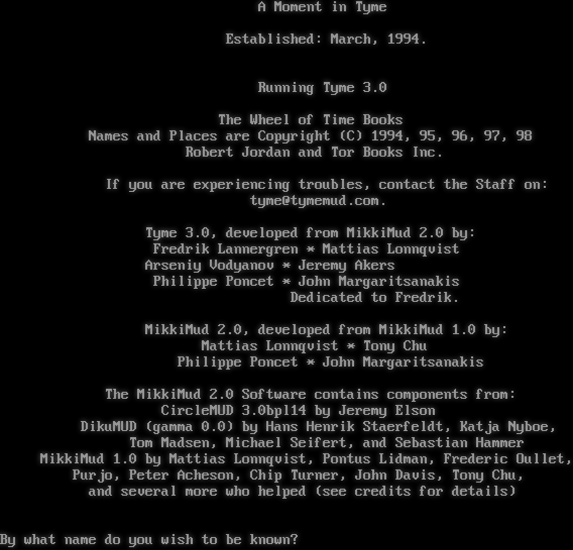 A Moment in Tyme Established: March, 1994. Running Tyme 3.0 The Wheel of Time Books Names and Places are Copyright (C) 1994, 95, 96, 97, 98 Robert Jordan and Tor Books Inc. If you are experiencing troubles, contact the Staff on: tyme@tymemud.com. Tyme 3.0, developed from MikkiMud 2.0 by: Fredrik Lannergren \* Mattias Lonnqvist Arseniy Vodyanov \* Jeremy Akers Philippe Poncet \* John Margaritsanakis Dedicated to Fredrik. MikkiMud 2.0, developed from MikkiMud 1.0 by: Mattias Lonnqvist \* Tony Chu Philippe Poncet \* John Margaritsanakis The MikkiMud 2.0 Software contains components from: CircleMUD 3.0bpl14 by Jeremy Elson DikuMUD (gamma 0.0) by Hans Henrik Staerfeldt, Katja Nyboe, Tom Madsen, Michael Seifert, and Sebastian Hammer MikkiMud 1.0 by Mattias Lonnqvist, Pontus Lidman, Frederic Oullet, Purjo, Peter Acheson, Chip Turner, John Davis, Tony Chu, and several more who helped (see credits for details) By what name do you wish to be known?
