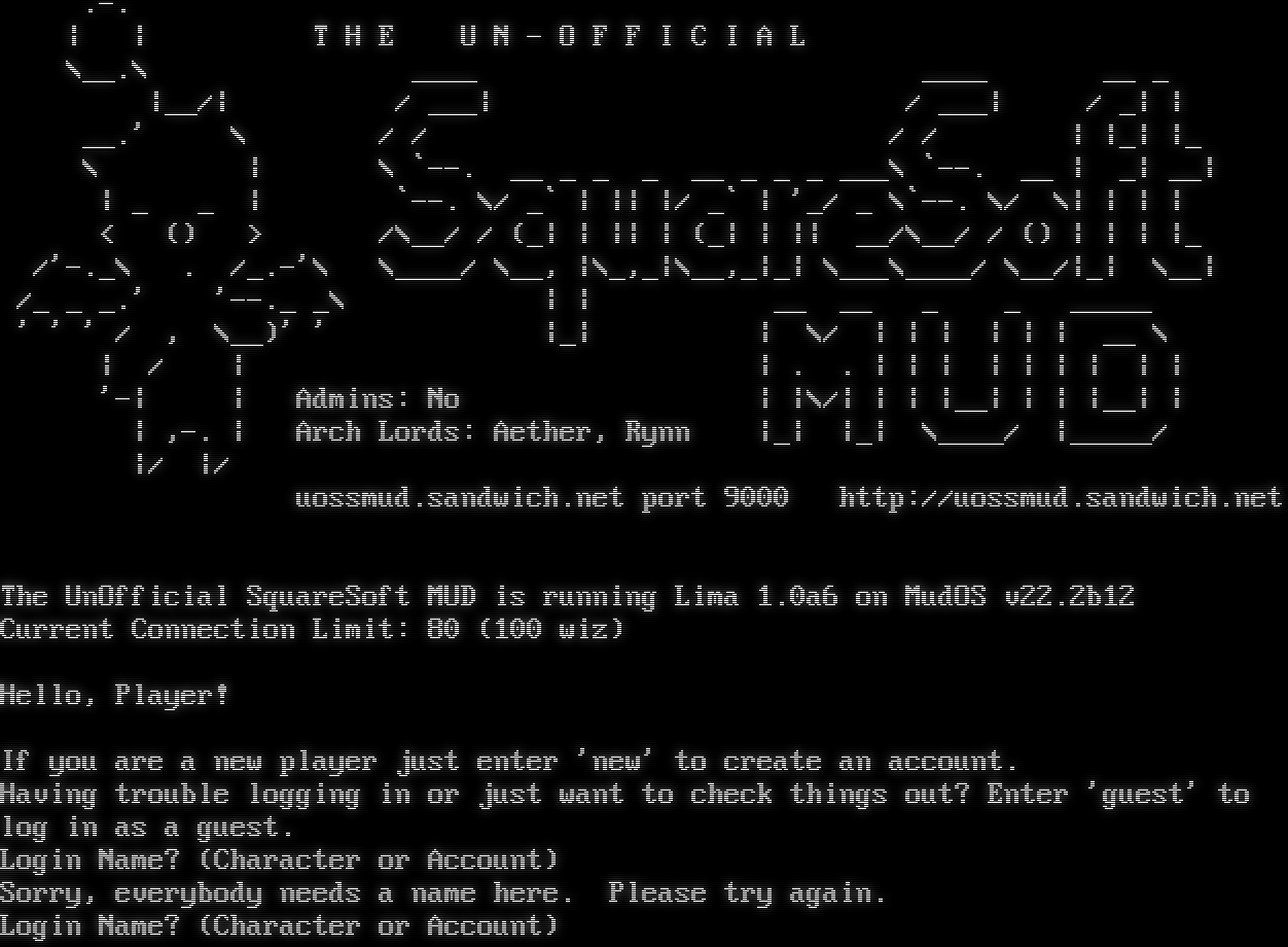 .-. \| \| T H E U N - O F F I C I A L \\__.\\ _โ€‹___ _โ€‹___ __ _ \|__/\| / ___\| / ___\| / _\| \| __.' \\ / / / / \| \|_\| \|_ \\ \| \\ \`--. __ _ _ _ __ _ _ _ ___\\ \`--. __ \| _\| __\| \| _ _ \| \`--. \\/ _\` \| \|\| \|/ _\` \| '_/ _ \\\`--. \\/ \\\| \| \| \| < () > /\\__/ / (_\| \| \|\| \| (_\| \| \|\| __/\\__/ / () \| \| \| \|_ /'-._\\ . /_.-'\\ \\_โ€‹___/ \\__, \|\\_,_\|\\__,_\|_\| \\___\\_โ€‹___/ \\__/\|_\| \\__\| /_ _ _.' '-โ€‹-._ _\\ \| \| __ __ _ _ _โ€‹____ ' ' ' / , \\__)' ' \|_\| \| \\/ \| \| \| \| \| \| __ \\ \| / \| \| . . \| \| \| \| \| \| \| \| \| '-\| \| Admins: No \| \|\\/\| \| \| \|__\| \| \| \|__\| \| \| ,-. \| Arch Lords: Aether, Rynn \|_\| \|_\| \\_โ€‹___/ \|_โ€‹____/ \|/ \|/ uossmud.sandwich.net port 9000 http://uossmud.sandwich.net The UnOfficial SquareSoft MUD is running Lima 1.0a6 on MudOS v22.2b12 Current Connection Limit: 80 (100 wiz) Hello, Player! If you are a new player just enter 'new' to create an account. Having trouble logging in or just want to check things out? Enter 'guest' to log in as a guest. Login Name? (Character or Account) Sorry, everybody needs a name here. Please try again. Login Name? (Character or Account)