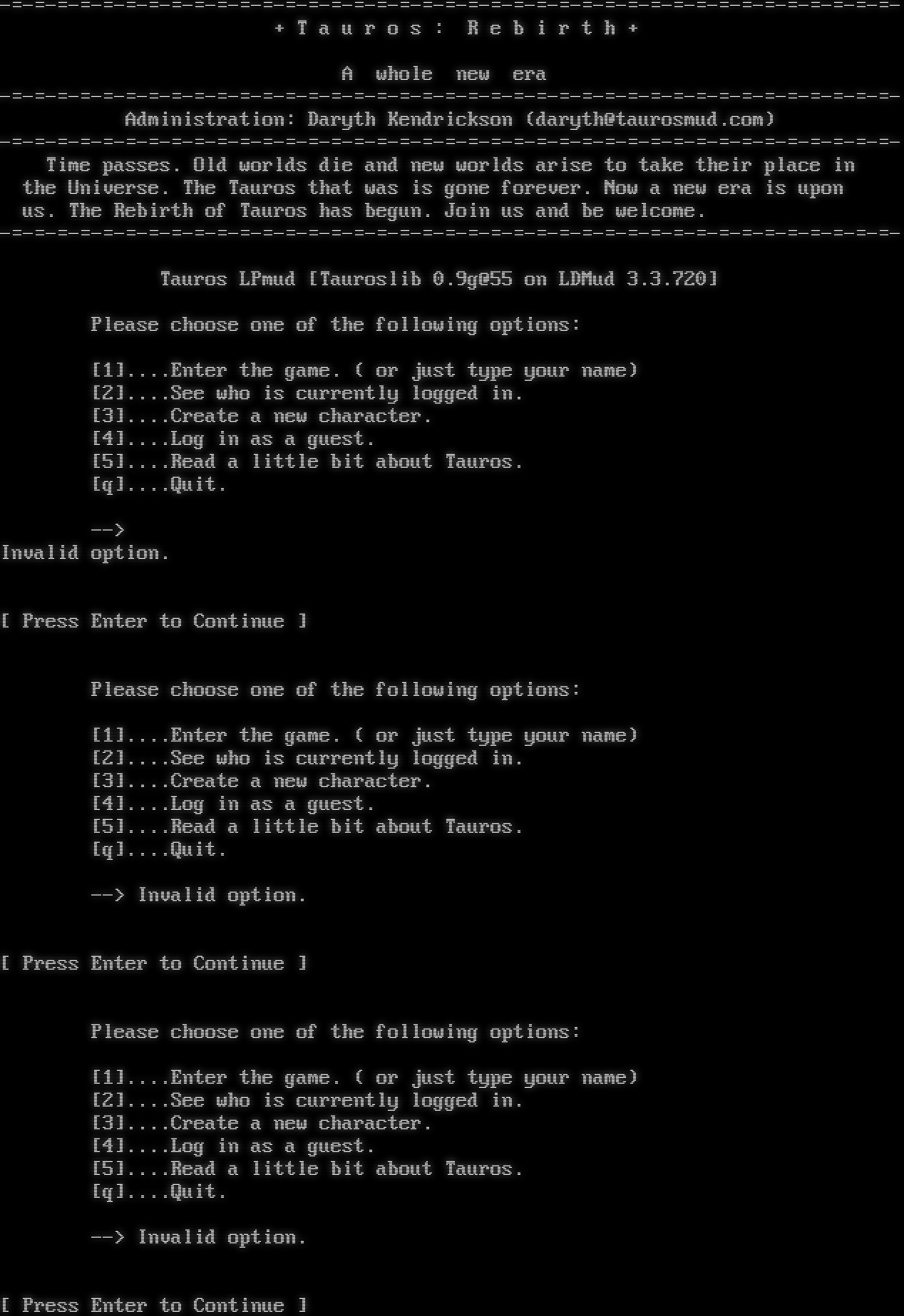 -โ€‹=-=-=-=-=-=-=-=-=-=-=-=-=-=-=-=-=-=-=-=-=-=-=-=-=-=-=-=-=-=-=-=-=-=-=-=-=-=-=- + T a u r o s : R e b i r t h + A whole new era -โ€‹=-=-=-=-=-=-=-=-=-=-=-=-=-=-=-=-=-=-=-=-=-=-=-=-=-=-=-=-=-=-=-=-=-=-=-=-=-=-=- Administration: Daryth Kendrickson (daryth@taurosmud.com) -โ€‹=-=-=-=-=-=-=-=-=-=-=-=-=-=-=-=-=-=-=-=-=-=-=-=-=-=-=-=-=-=-=-=-=-=-=-=-=-=-=- Time passes. Old worlds die and new worlds arise to take their place in the Universe. The Tauros that was is gone forever. Now a new era is upon us. The Rebirth of Tauros has begun. Join us and be welcome. -โ€‹=-=-=-=-=-=-=-=-=-=-=-=-=-=-=-=-=-=-=-=-=-=-=-=-=-=-=-=-=-=-=-=-=-=-=-=-=-=-=- Tauros LPmud [Tauroslib 0.9g@55 on LDMud 3.3.720] Please choose one of the following options: [1].โ€‹...Enter the game. ( or just type your name) [2].โ€‹...See who is currently logged in. [3].โ€‹...Create a new character. [4].โ€‹...Log in as a guest. [5].โ€‹...Read a little bit about Tauros. [q].โ€‹...Quit. --> Invalid option. [ Press Enter to Continue ] Please choose one of the following options: [1].โ€‹...Enter the game. ( or just type your name) [2].โ€‹...See who is currently logged in. [3].โ€‹...Create a new character. [4].โ€‹...Log in as a guest. [5].โ€‹...Read a little bit about Tauros. [q].โ€‹...Quit. --> Invalid option. [ Press Enter to Continue ] Please choose one of the following options: [1].โ€‹...Enter the game. ( or just type your name) [2].โ€‹...See who is currently logged in. [3].โ€‹...Create a new character. [4].โ€‹...Log in as a guest. [5].โ€‹...Read a little bit about Tauros. [q].โ€‹...Quit. --> Invalid option. [ Press Enter to Continue ]